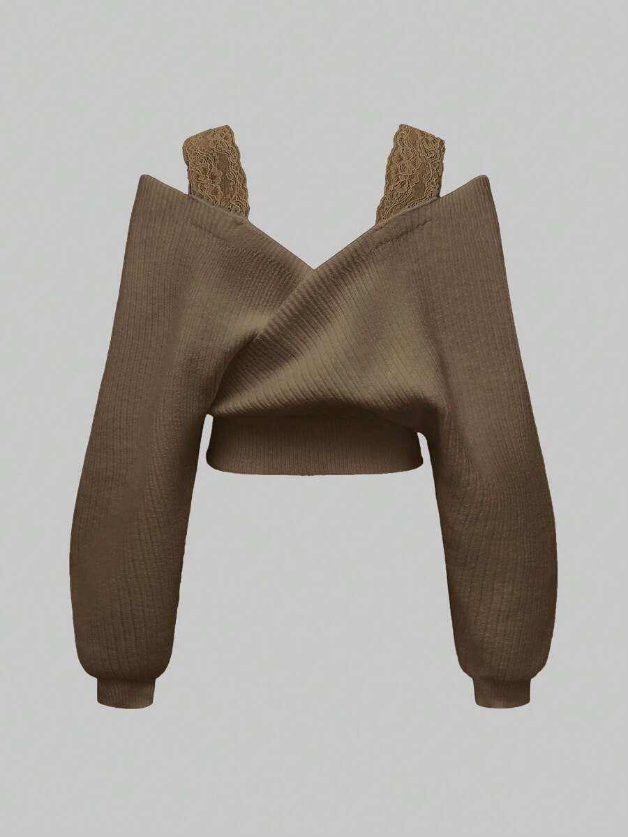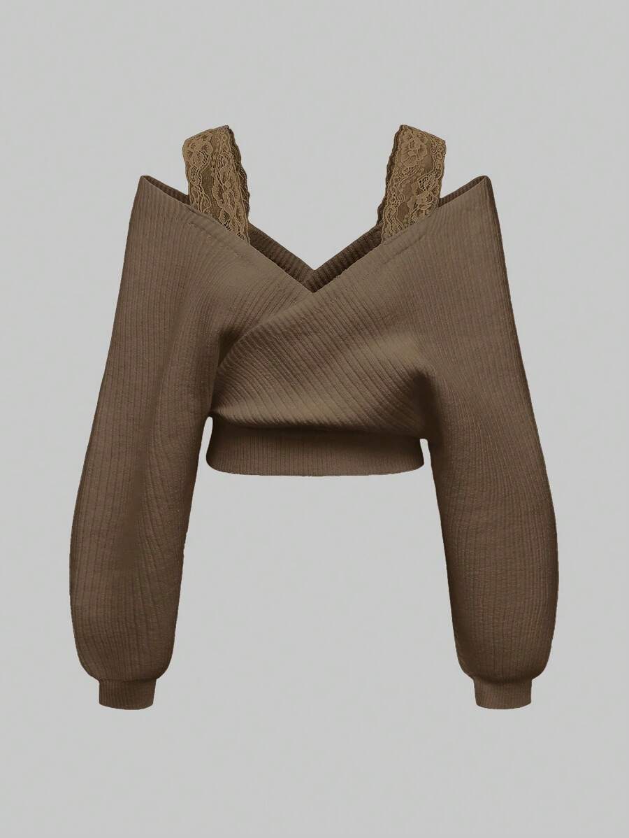 Suéter tipo camisola sexy de encaje, de corte casual y escote profundo en V con hombros descubiertos, estilo francés