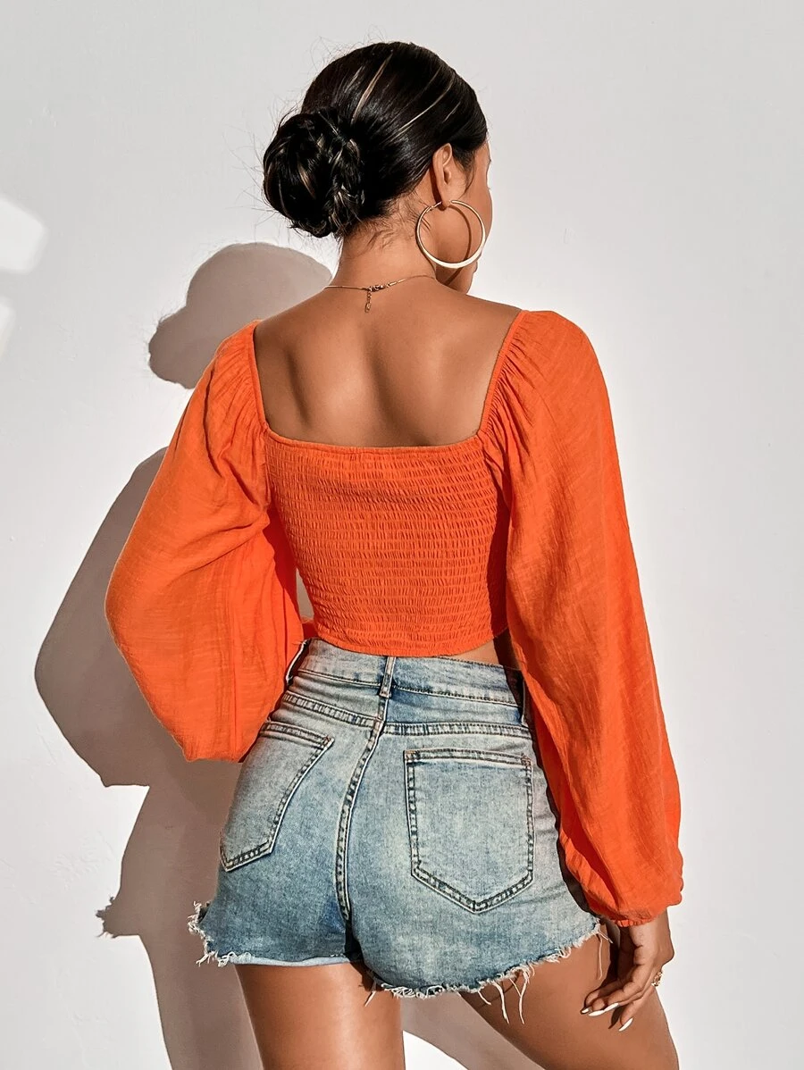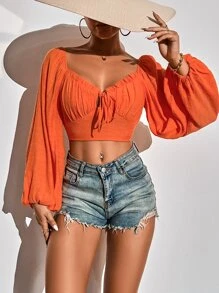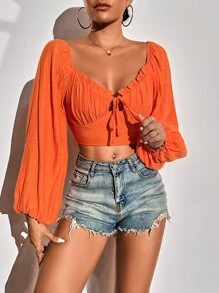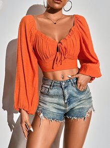 Blusa fruncido escote corazón con cordón delantero pecho con fruncido de manga farol con fruncido