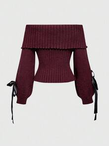 Kawaii Suéter de mujer con mangas abullonadas, decoración de lazo y hombros descubiertos, suave y lindo, adecuado para Halloween, Navidad, Año Nuevo, Día de San Valentín, multiocasión, edición navideña