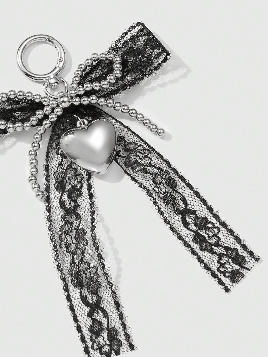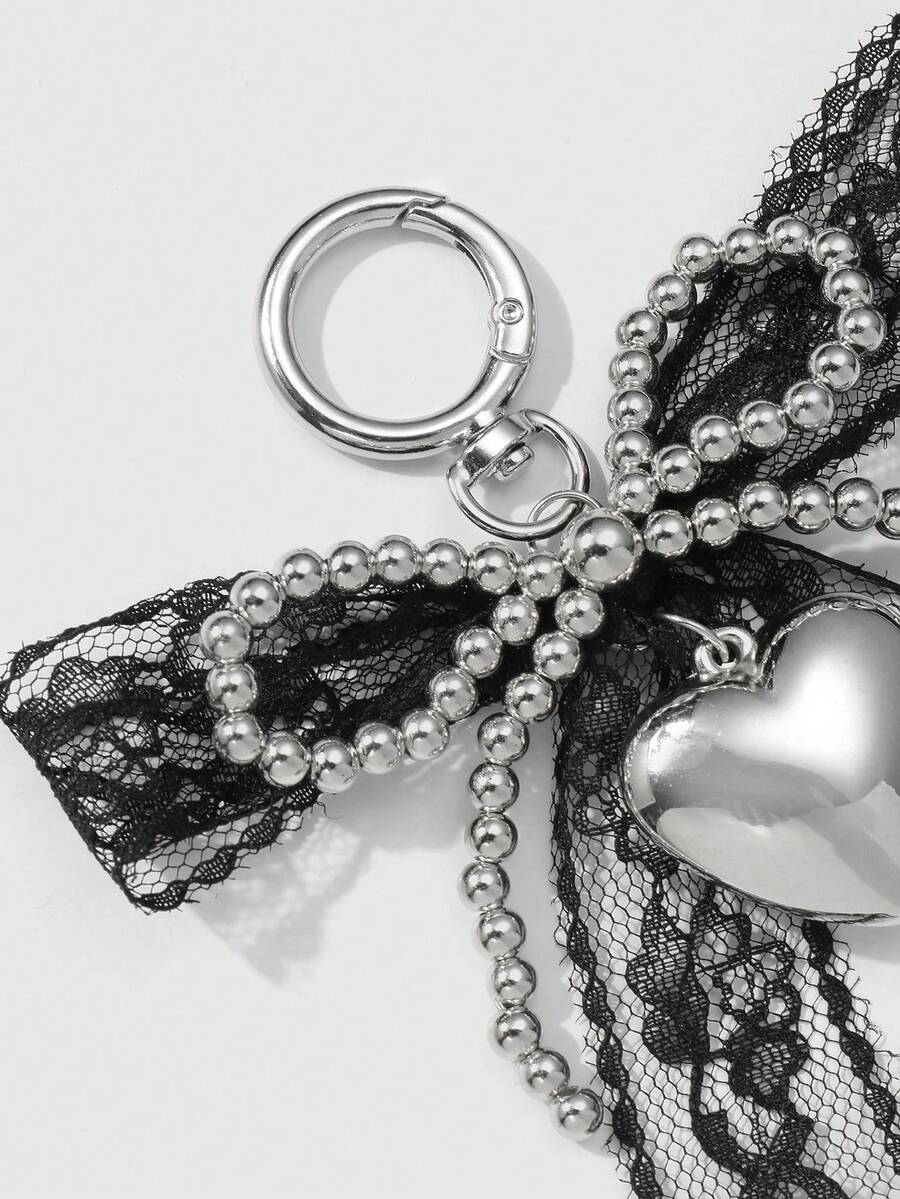 Goth 1 pieza Llavero con colgante en forma de corazón 3D con estilo gótico hecho a mano, con cuentas de color plata CCB, lazo de encaje negro, accesorio colgante ideal para mujer, para uso diario o regalo del Día de San Valentín
