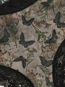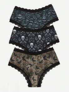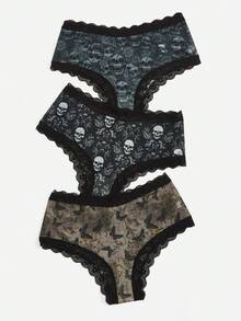 Goth 3 piezas Set bragas estampado de cráneo ribete con encaje