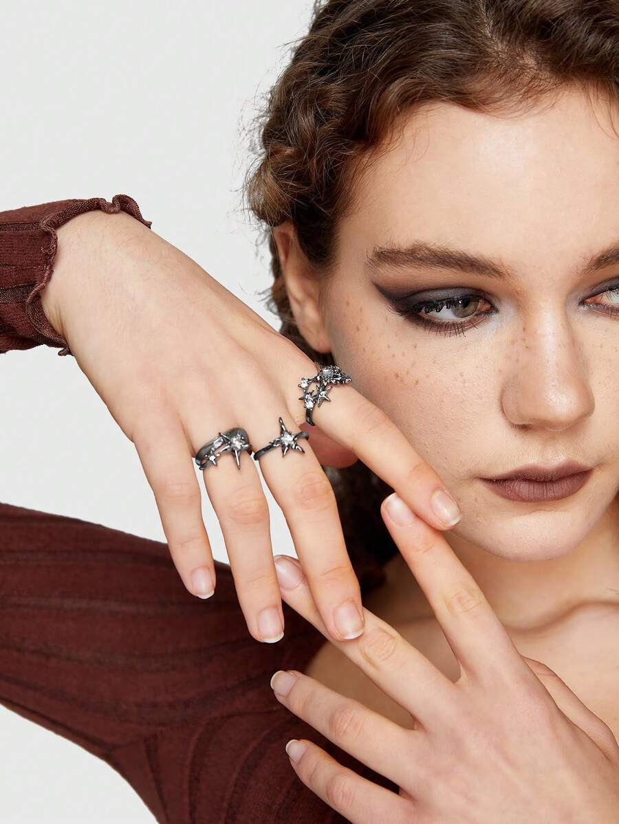 Goth 3 piezas Anillo moda aleación de zinc con estrella con diseño de diamante de imitación para mujeres para regalo de citas