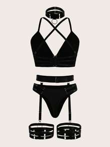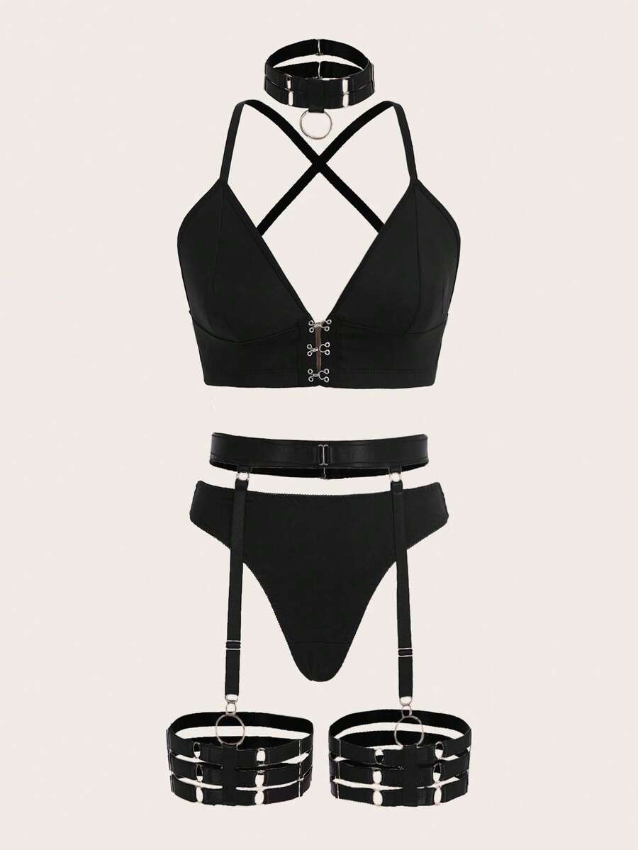 Goth 6 piezas con tira cruzada con liga Set de lencería con 1 par Anillo de pierna