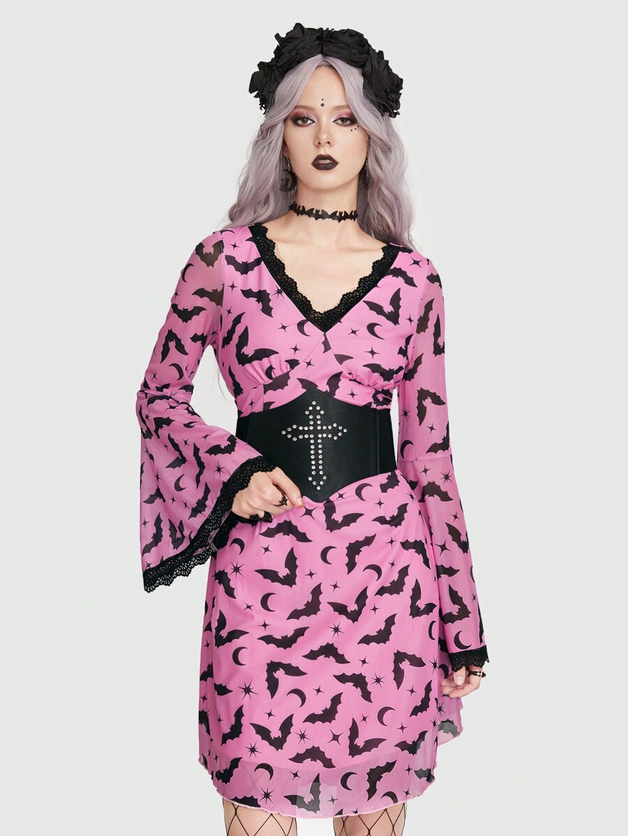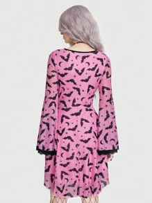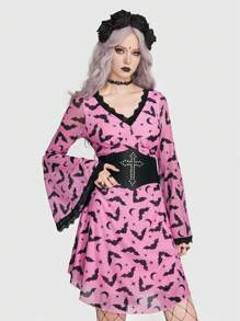 Goth Vestido con estampado de murciélago con encaje en contraste de manga campana sin corsé