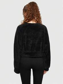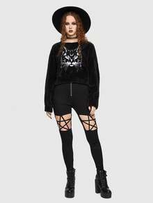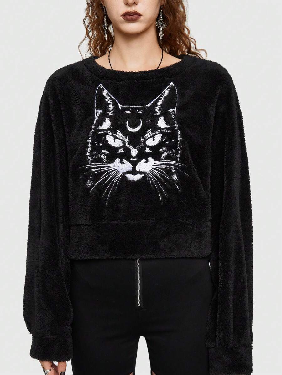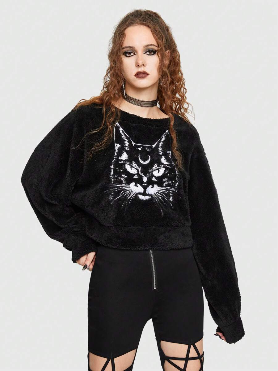 Goth Sudadera teddy con estampado de gato y hombros caídos
