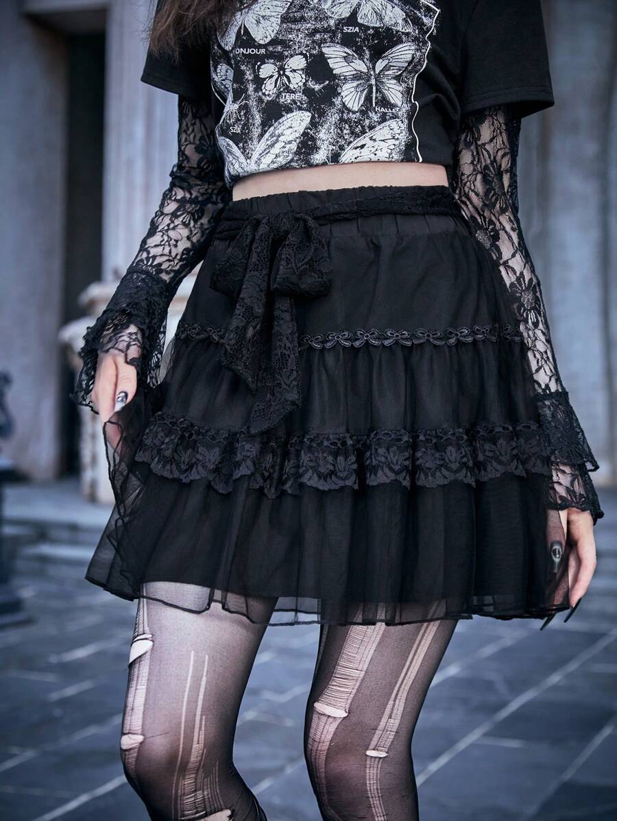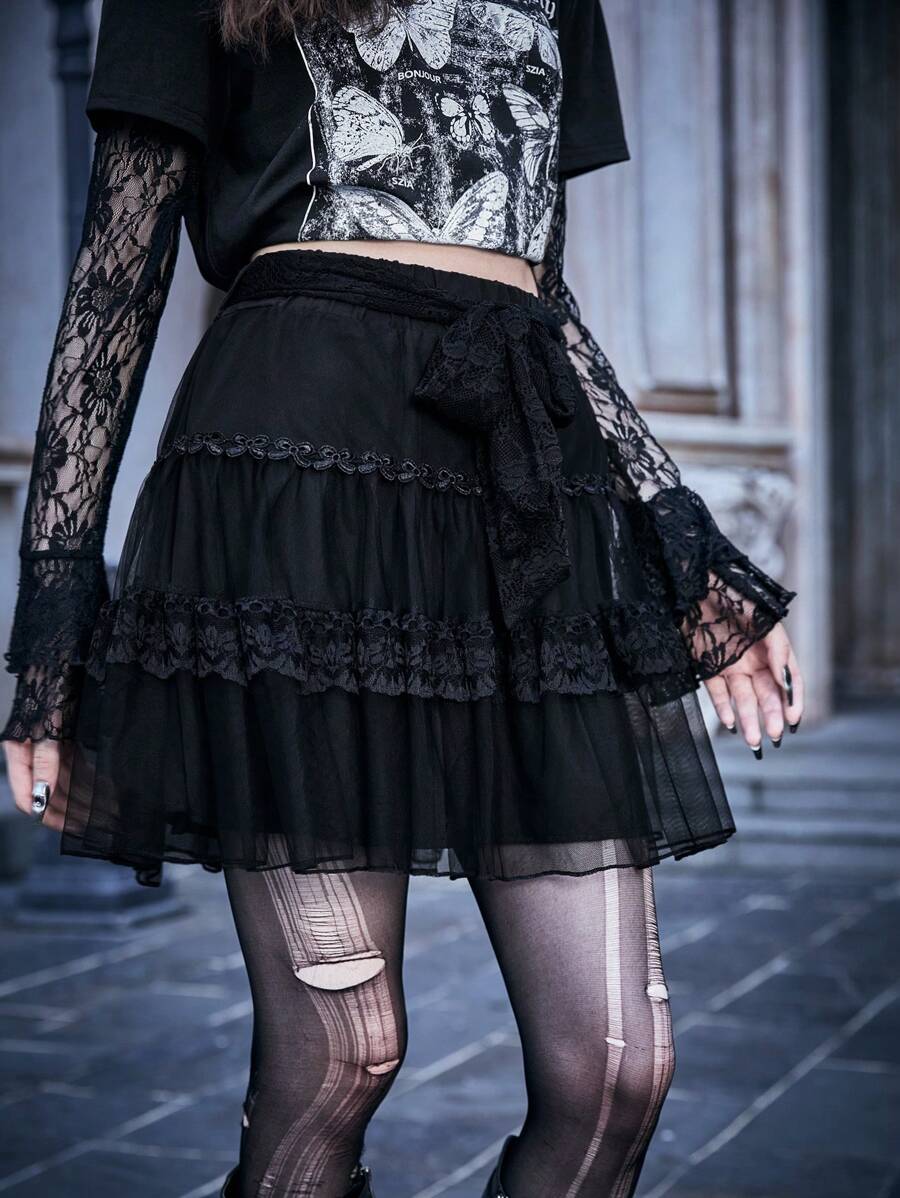Goth Falda con encaje en contraste con cinturón ribete fruncido