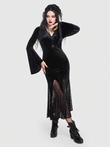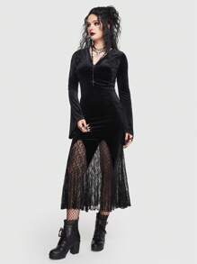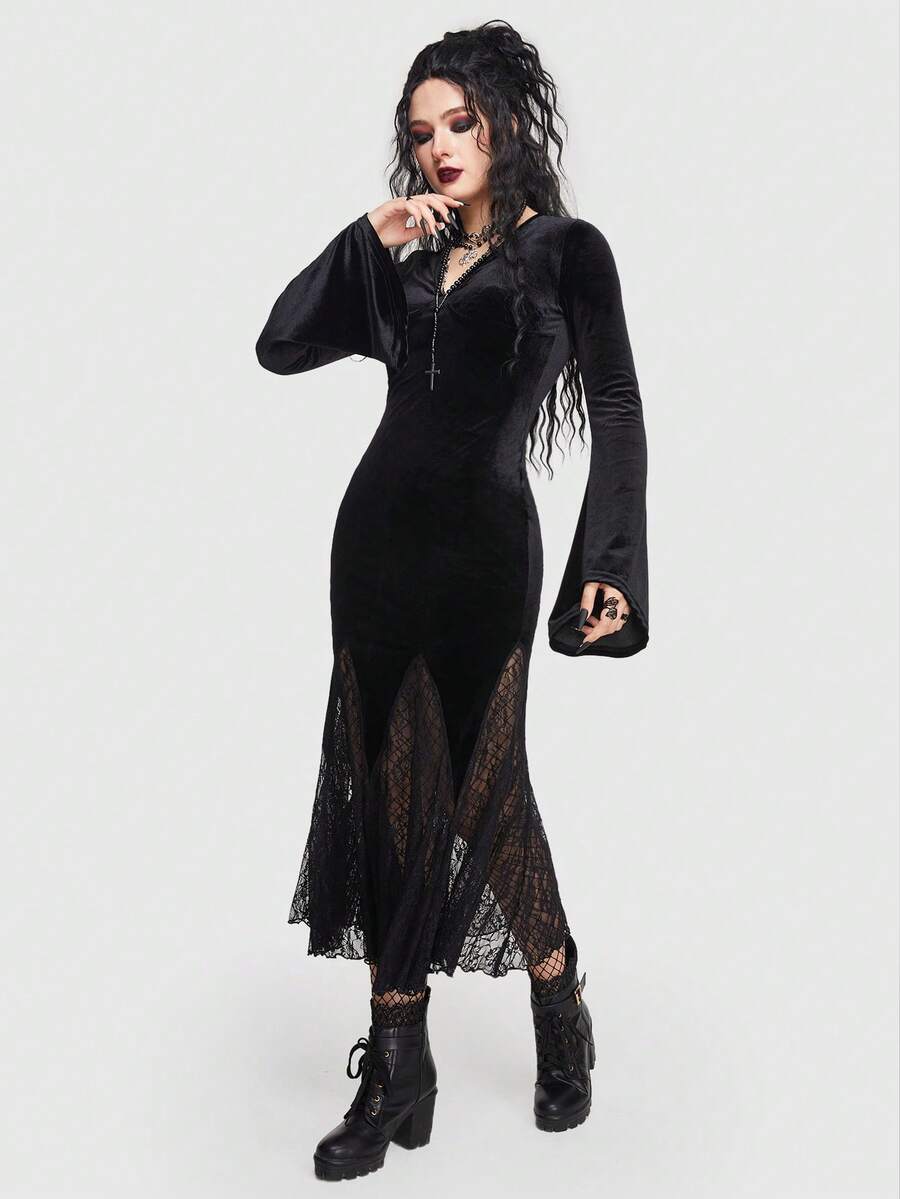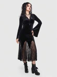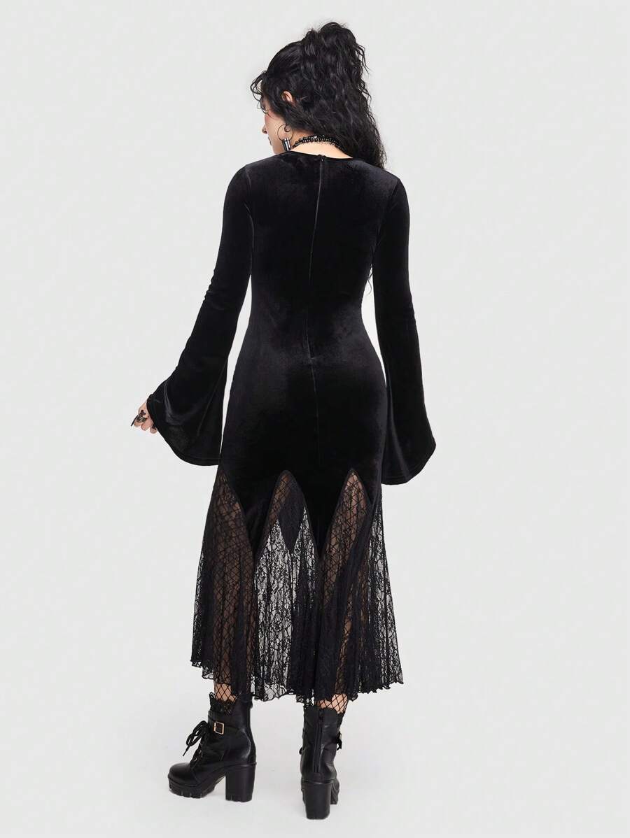 Goth Vestido con encaje en contraste manga de campana bajo sirena de terciopelo