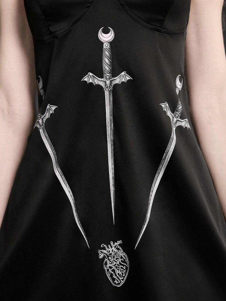 Goth Vestido mini ajustado con estampado de corazón y ribete de encaje en contraste, estilo Lolita oscuro para mujeres