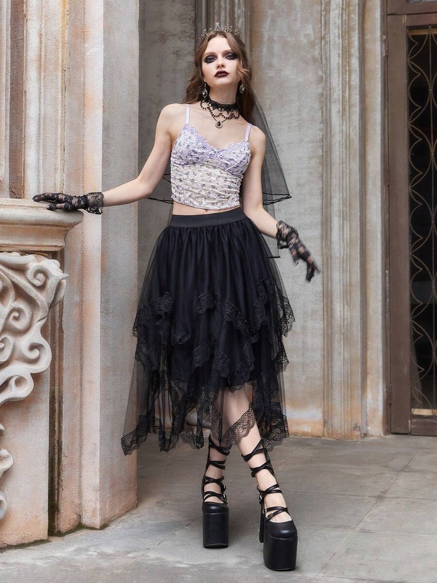 Goth Top de tirantes floral con encaje en contraste