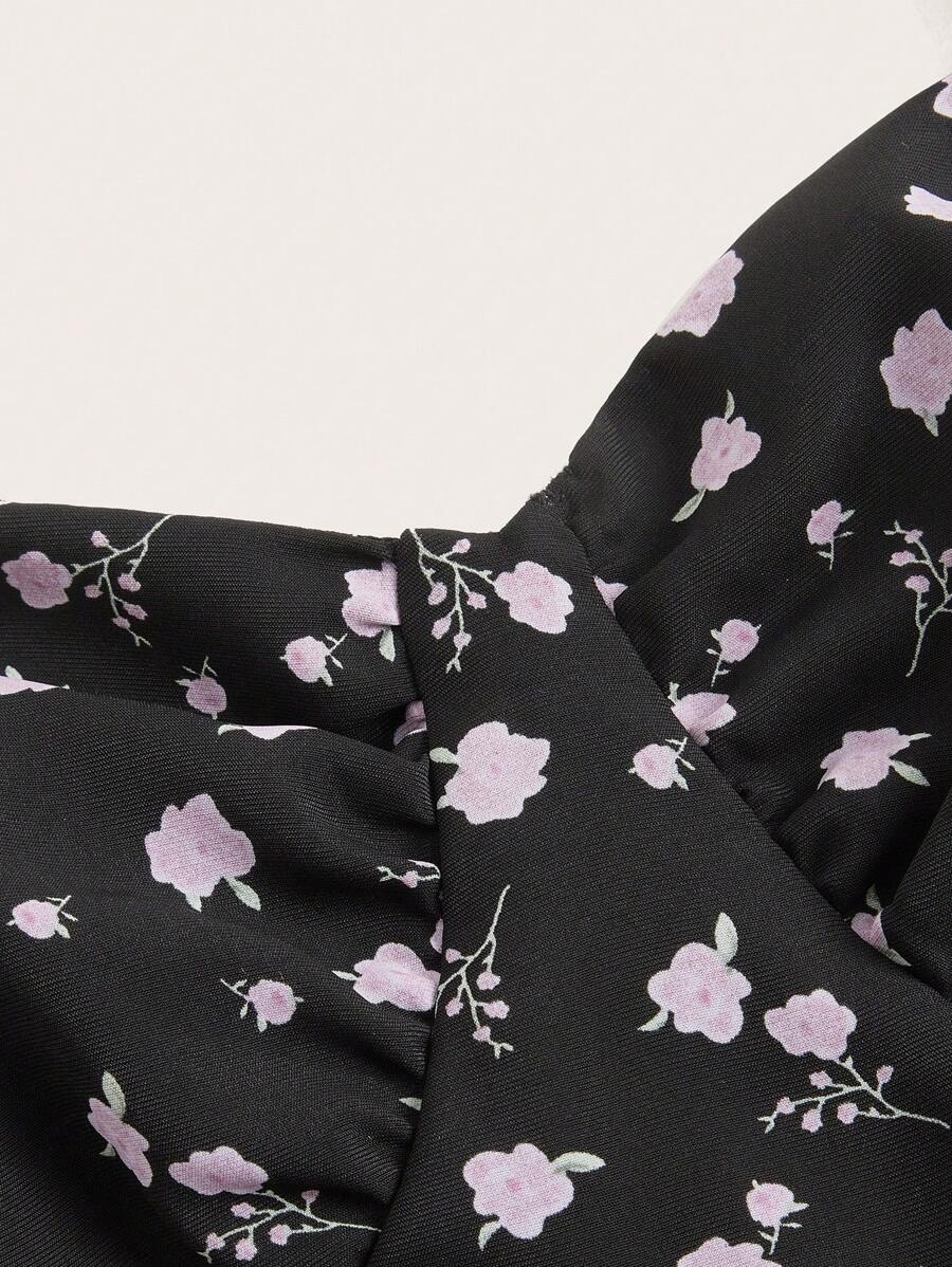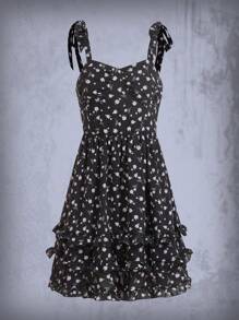 Goth Vestido de tirantes floral de hombros con cordón ribete con fruncido