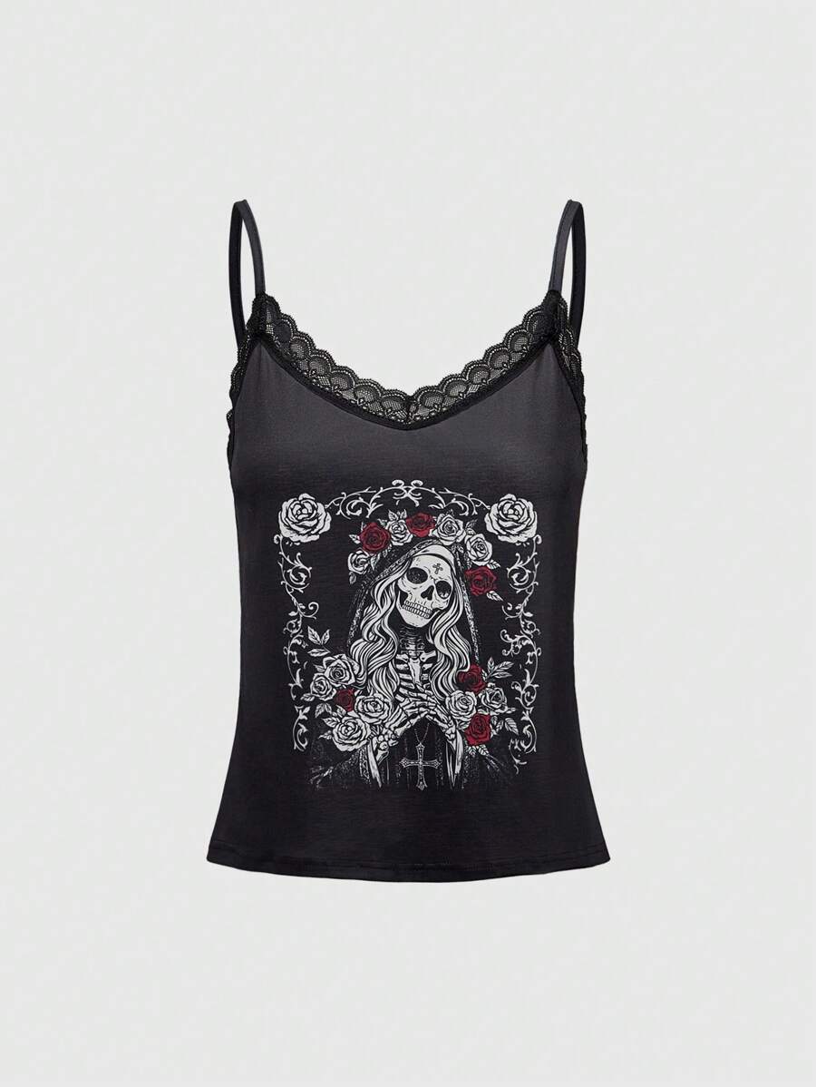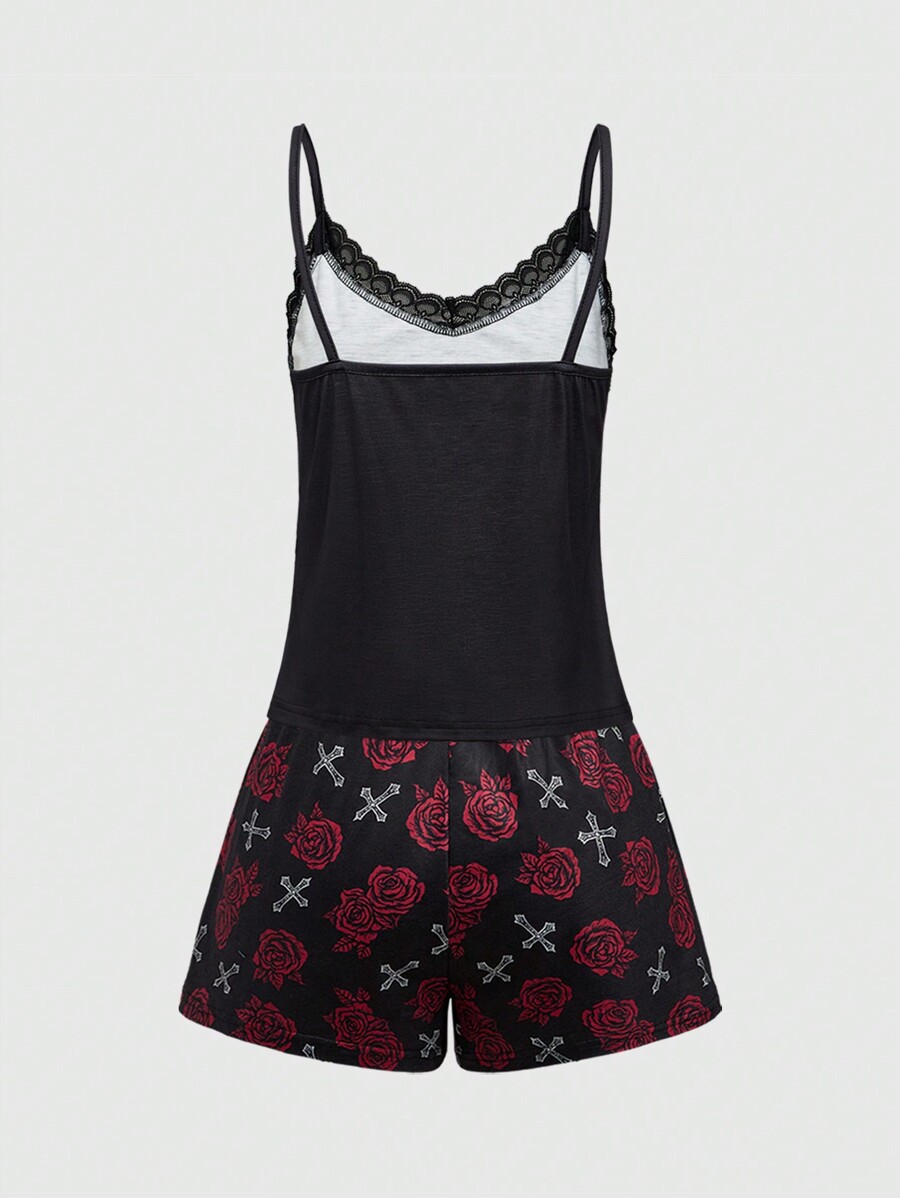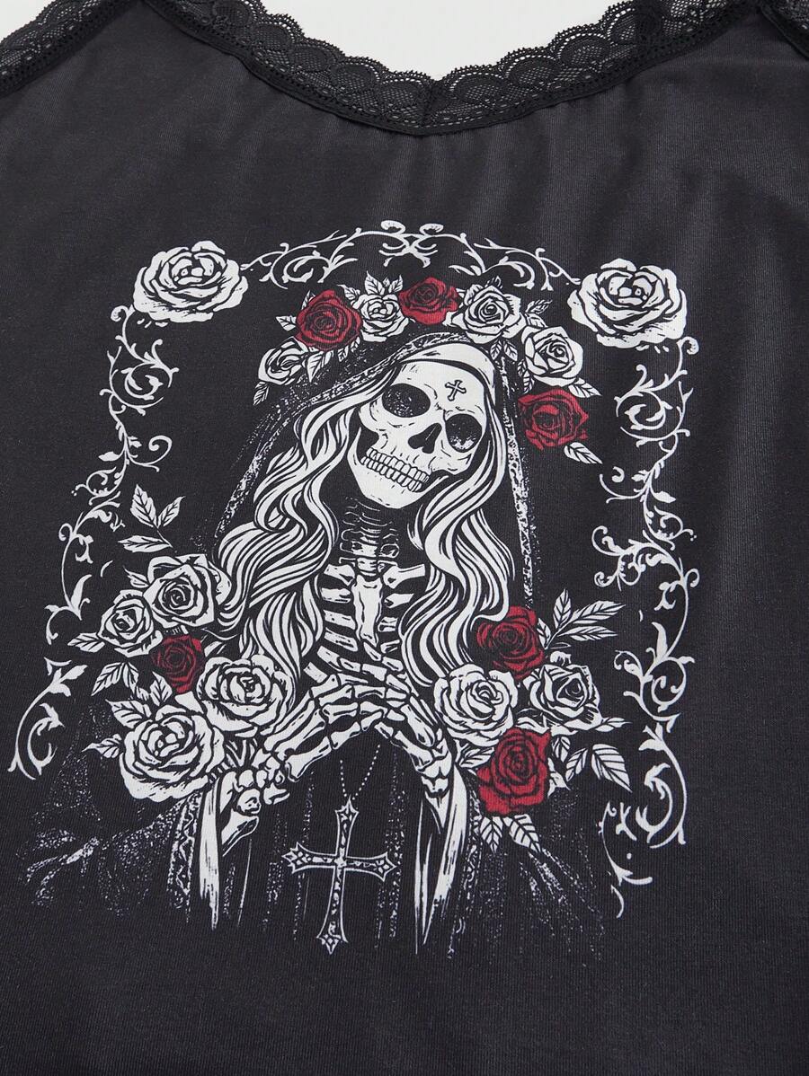 Goth Conjunto de camiseta de tirantes y shorts de pijama casual con encaje y patrón de cruz de rosa de esqueleto gótico