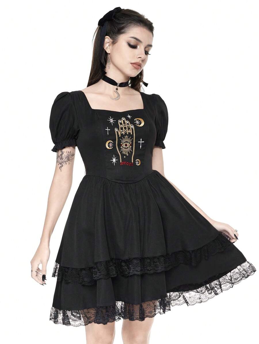 Goth Vestido de mujer con mangas abullonadas, cintura acampanada, bordado de strass y diseño gráfico vintage gótico