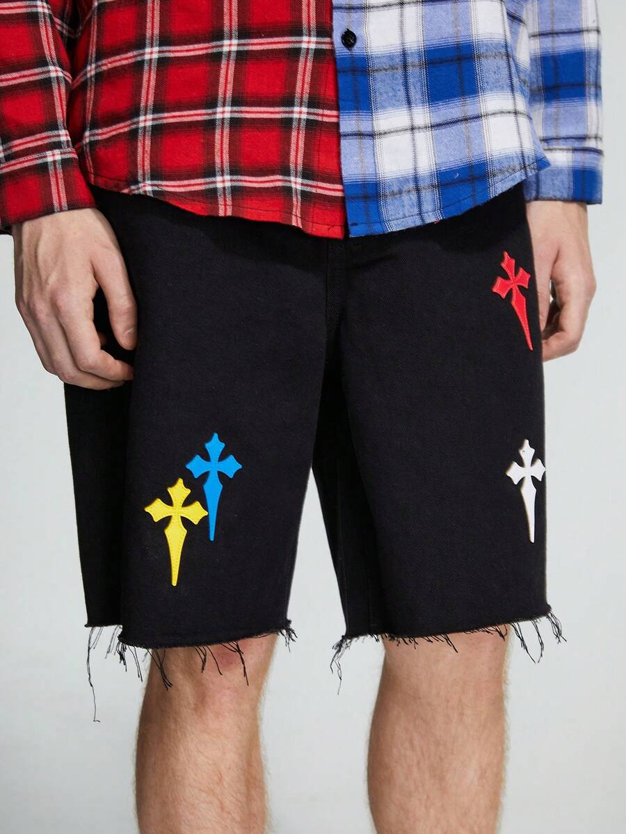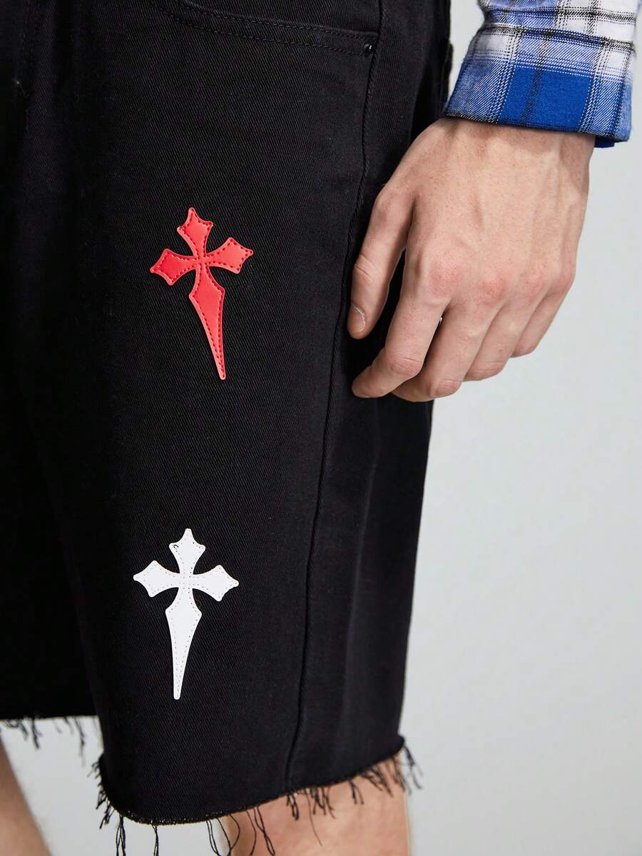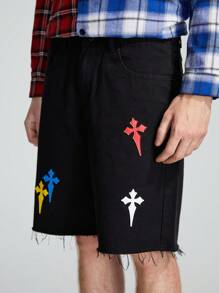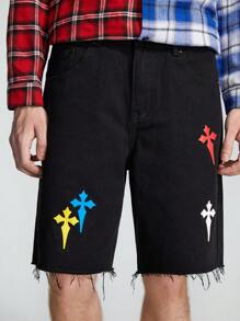 Goth Hombres Shorts en mezclilla cruzado con estampado ribete sin dobladillo