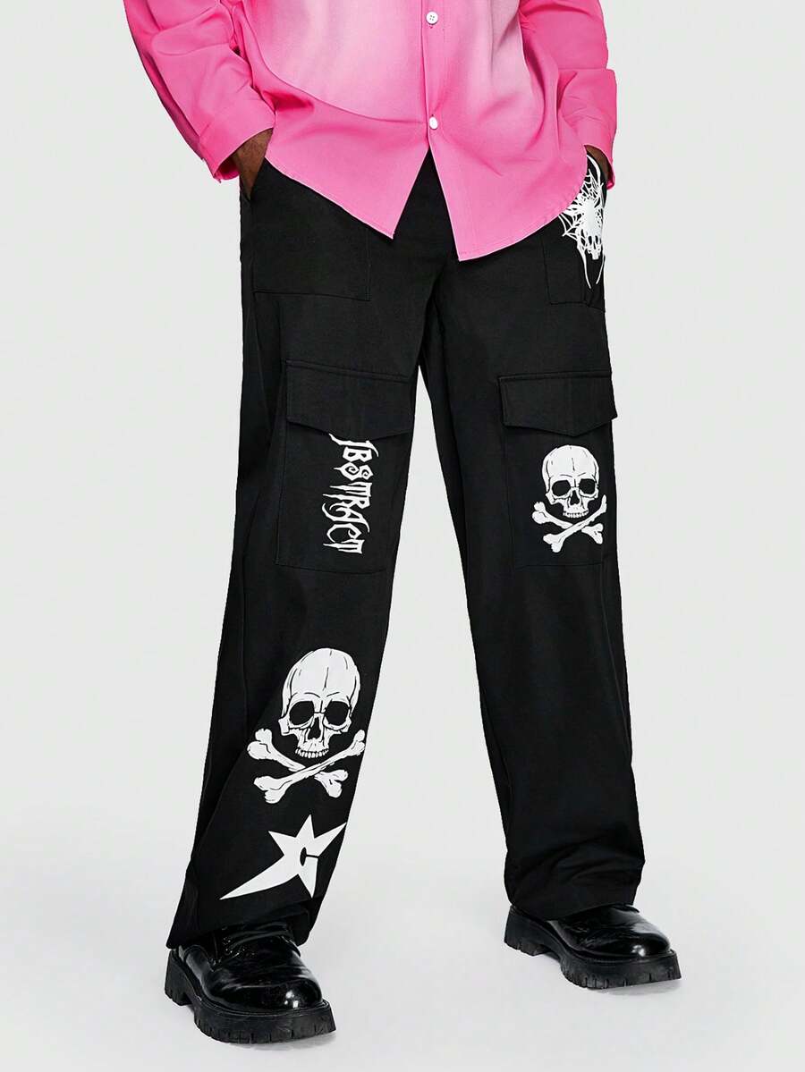 Goth Hombres Pantalones con estampado de cráneo y letra con bolsillo con solapa