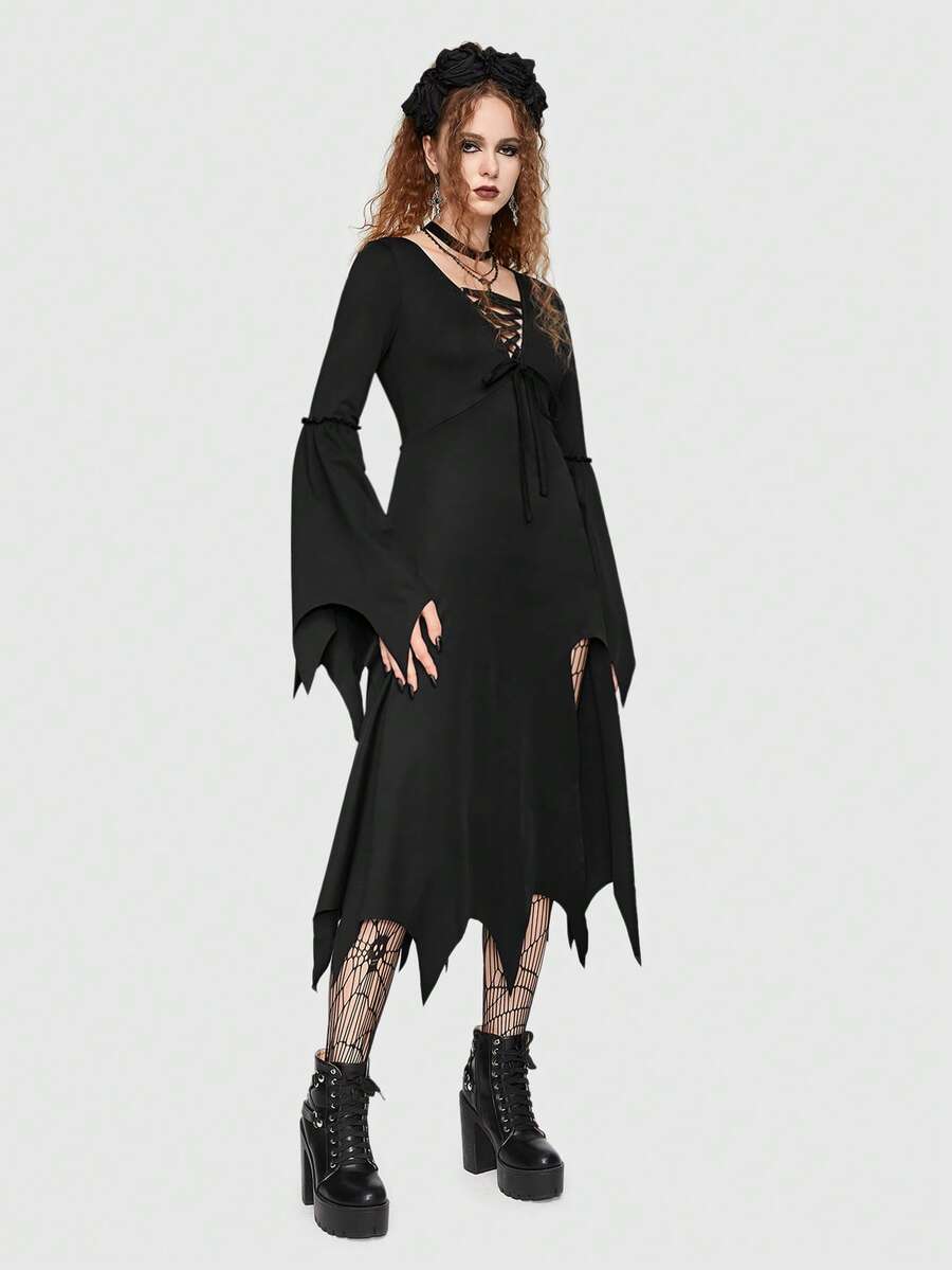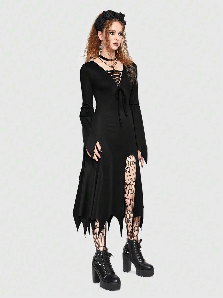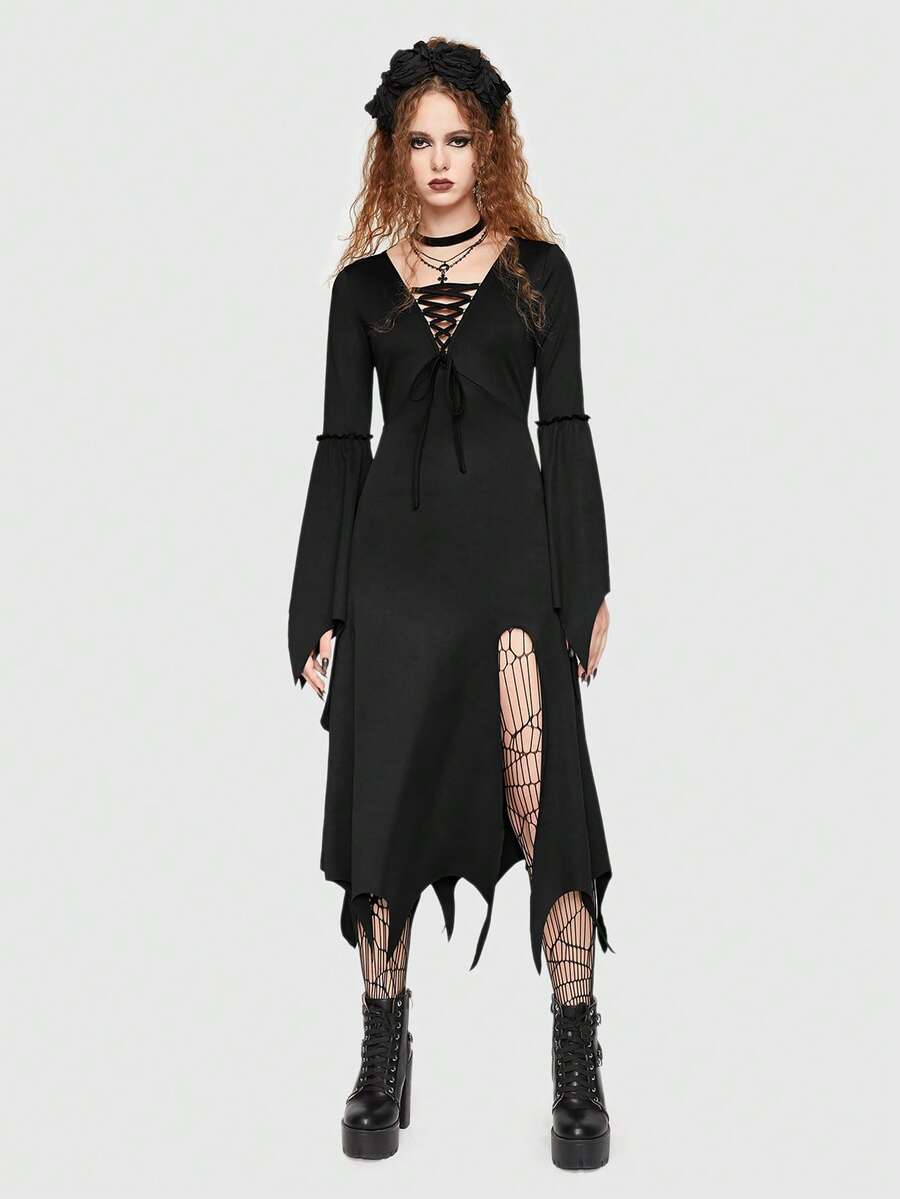Goth Vestido con cordón delantero de manga amplia con abertura bajo asimétrico
