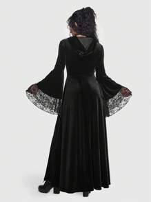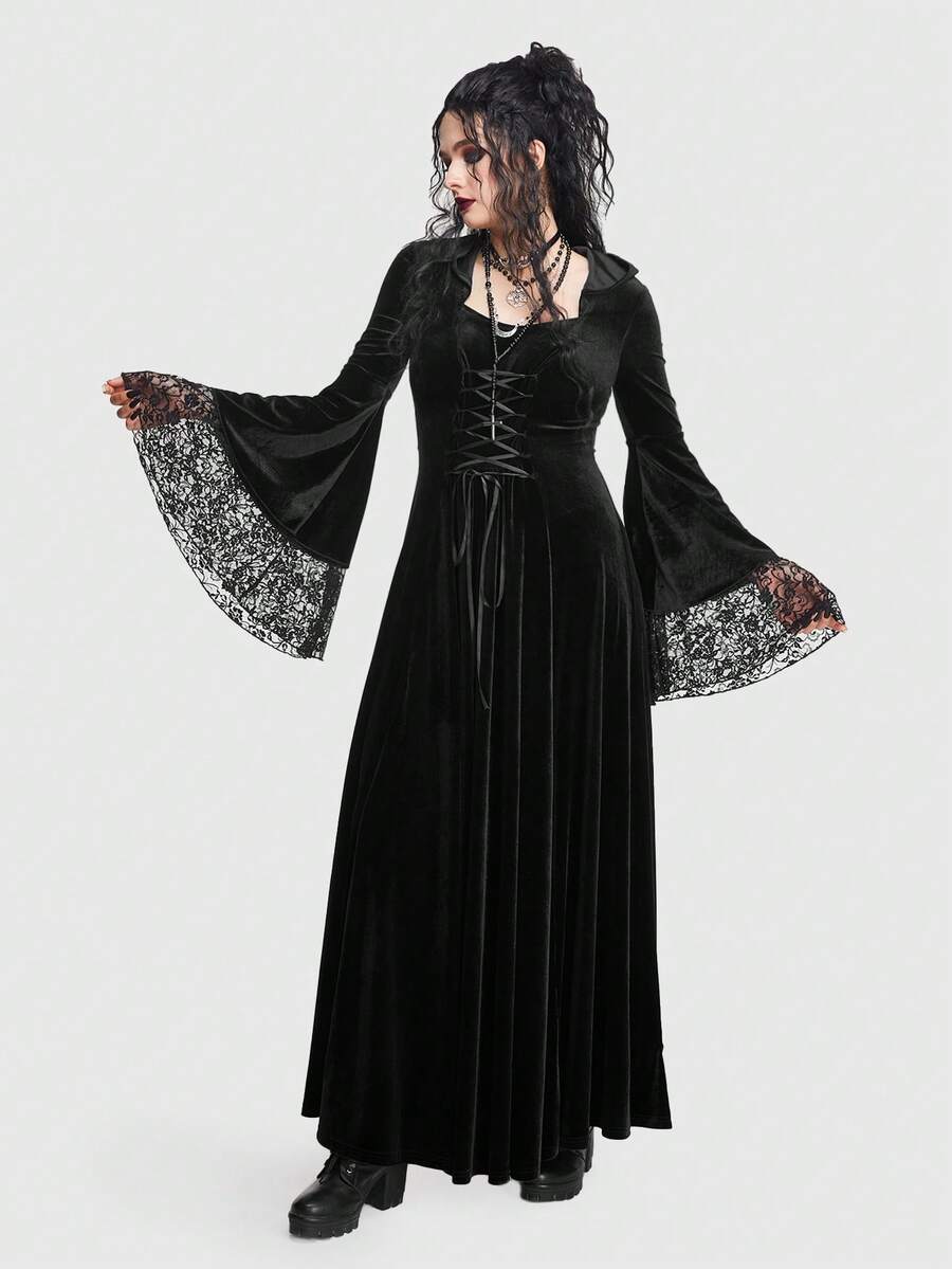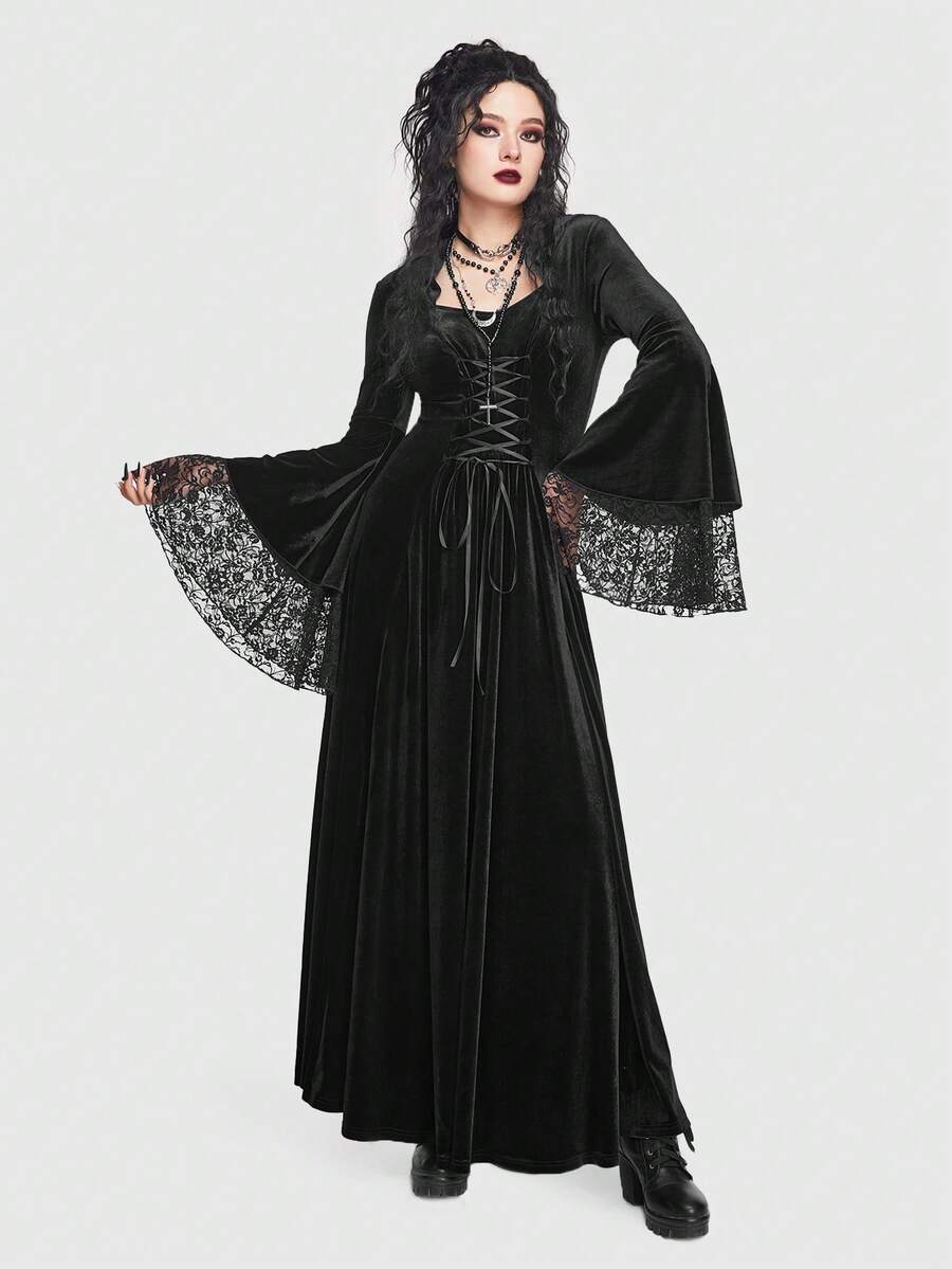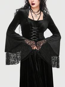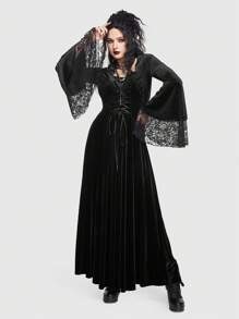 Goth Vestido con cordón delantero panel con encaje de manga con volante de terciopelo