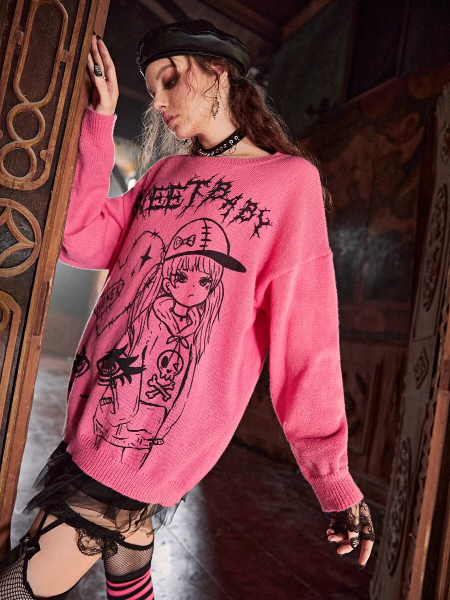 Goth Jersey con letra con figura de dibujos animados de hombros caídos