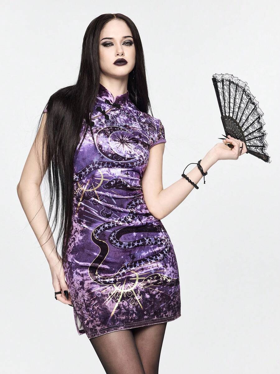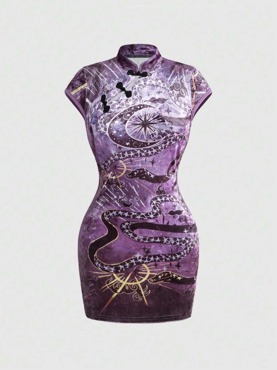 Goth Nuevo vestido corto de mujer con abertura lateral, estampado de foil con totem de serpiente y media luna de estilo chino en terciopelo diamante