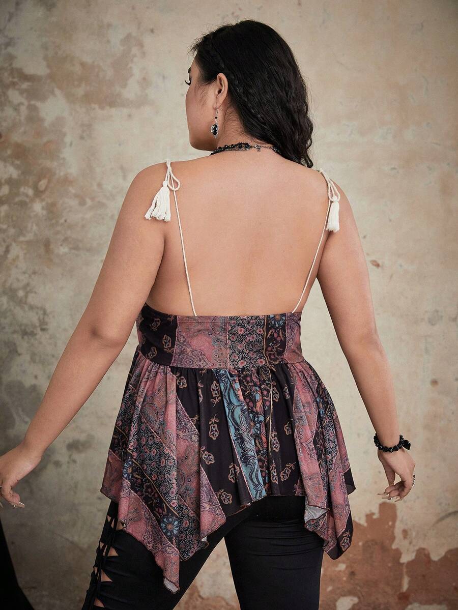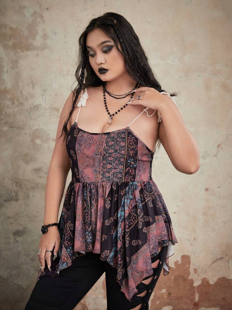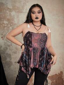 Goth Talla grande Top de tirantes con estampado de retazo de hombros con cordón bajo asimétrico