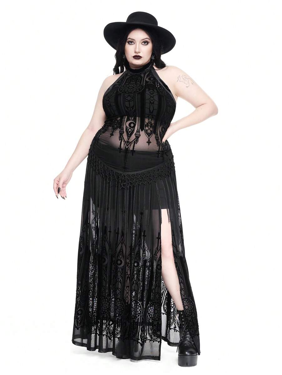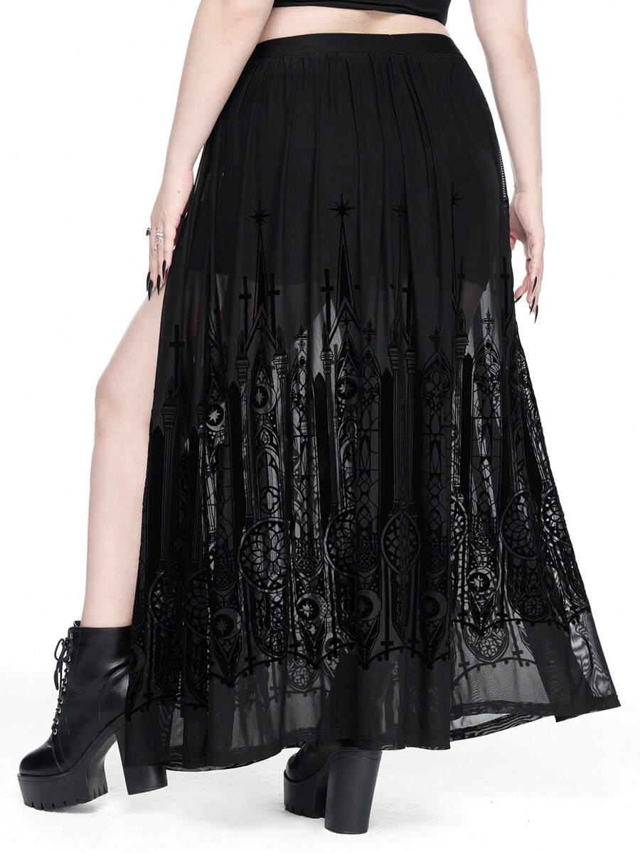 Goth Falda de talla grande estilo retro y vintage con estampado flocado de castillo gótico