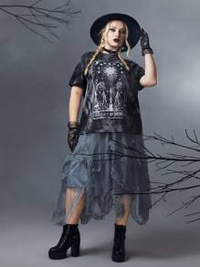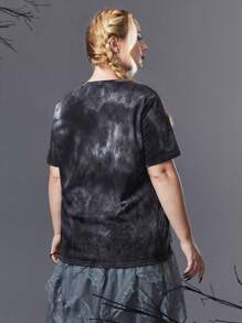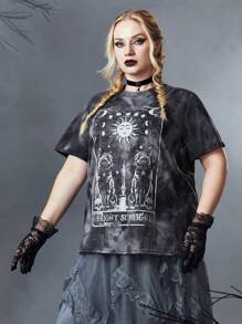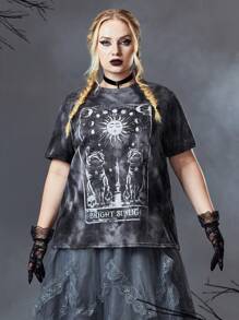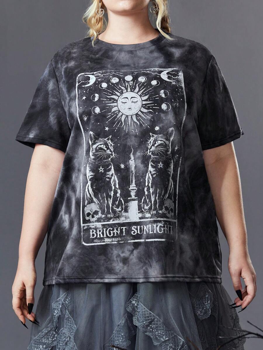 Goth Playera Estampada Con Diseño Tie Dye Y Dibujo De Sol Y Gato En Talla Plus