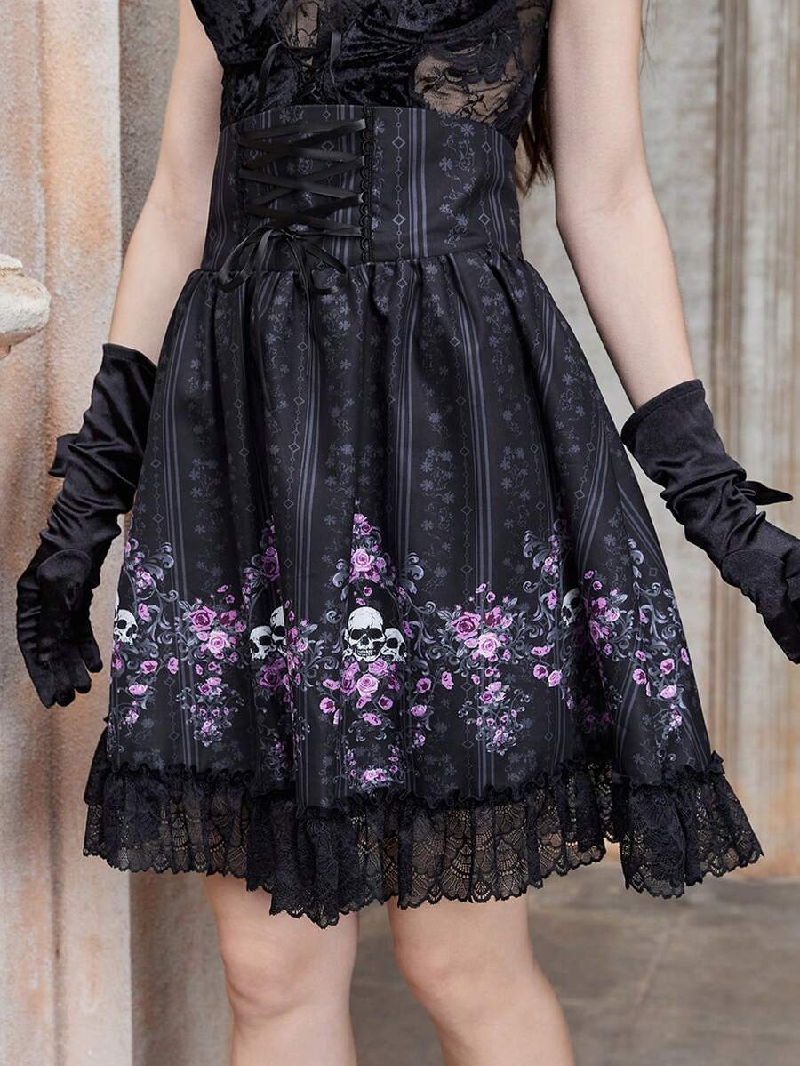 Goth Falda estampado de cráneo con cordón delantero bajo con fruncido