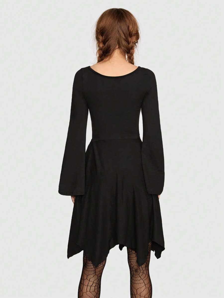 Goth Vestido unicolor con cordón de manga campana bajo hanky