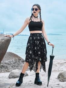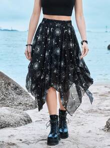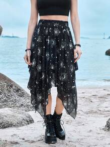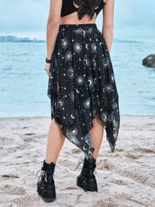 Goth Falda con estampado de sol y luna bajo asimétrico