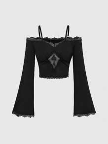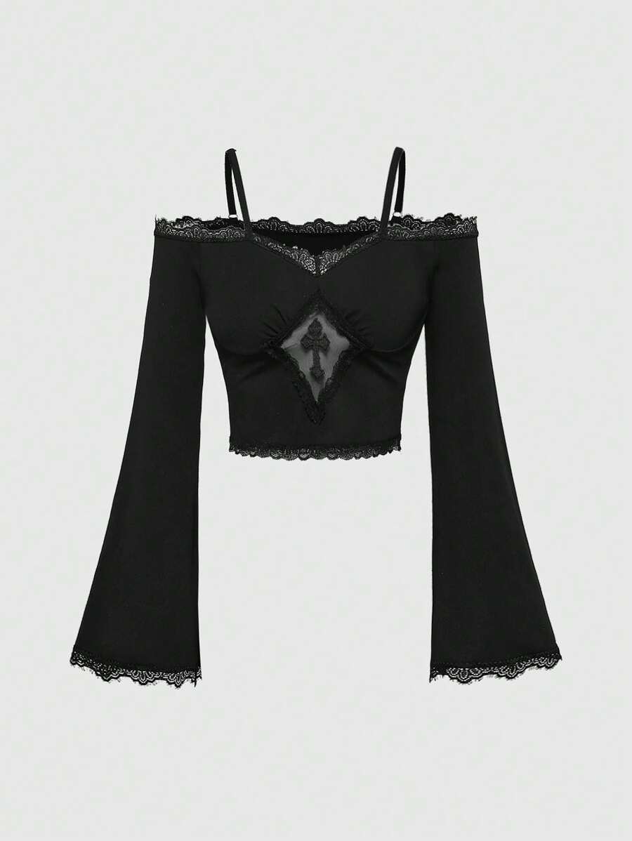 Goth Blusa con mangas acampanadas y bordado de cruz calada en estilo gótico vintage para mujeres