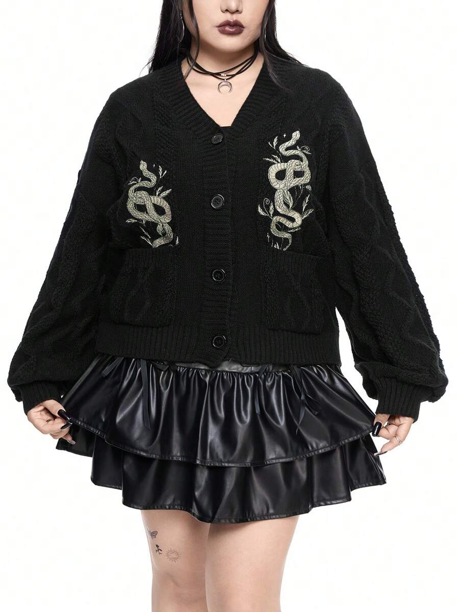Goth Cárdigan delgado de talla grande, estilo vintage casual y versátil, con bolsillo bordado con motivo de planta y hoja de serpiente en la manga farol