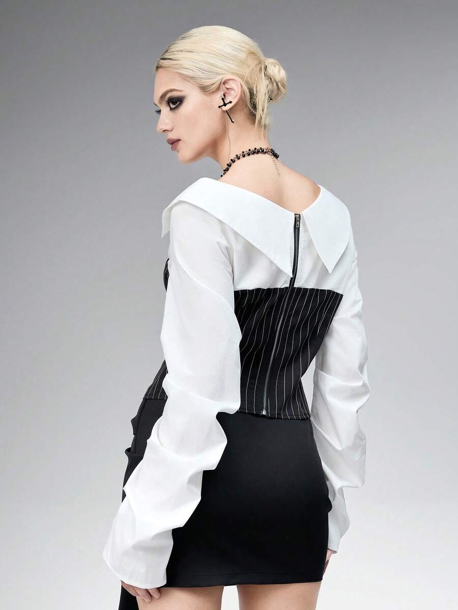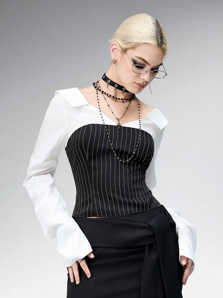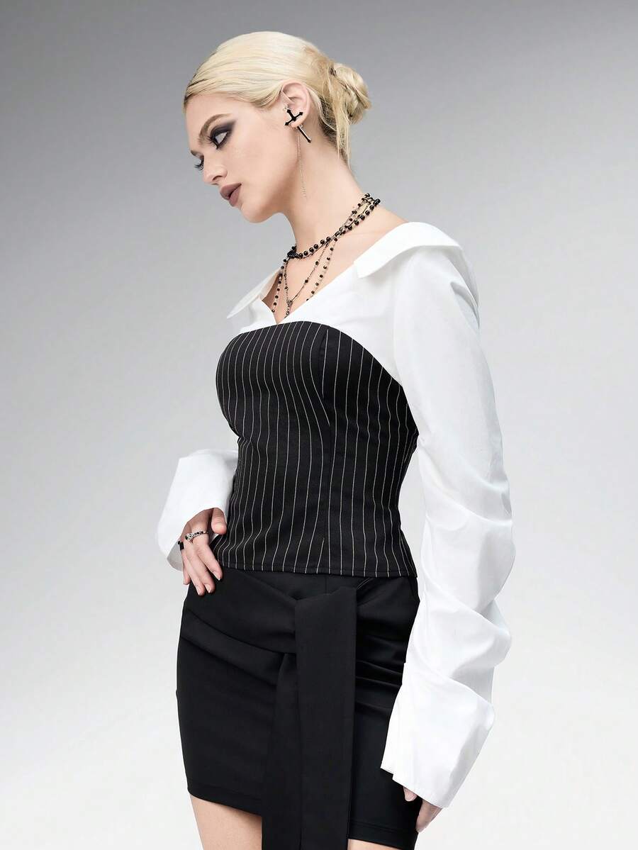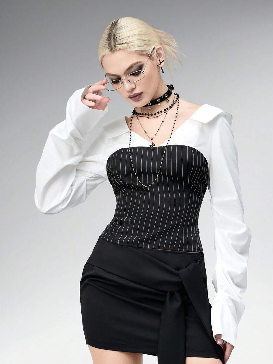 Goth Blusa de mujer con cuello en V plisado, parche y rayas de manga larga