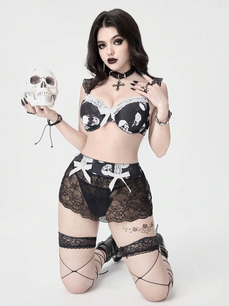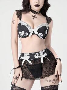 Goth Conjunto de lencería con estampado de esqueleto gótico de Halloween, encaje y lazo, con aro para mujer