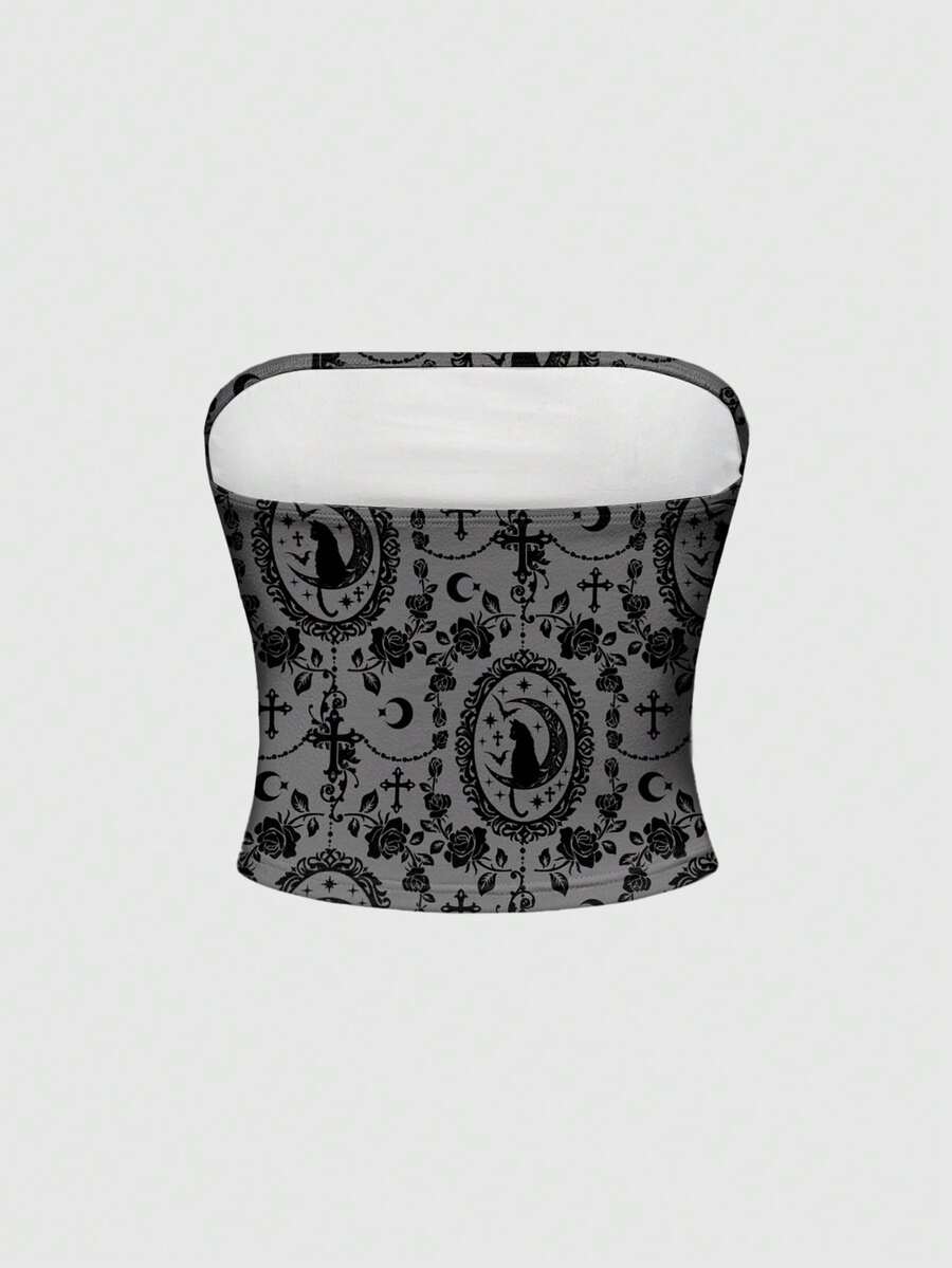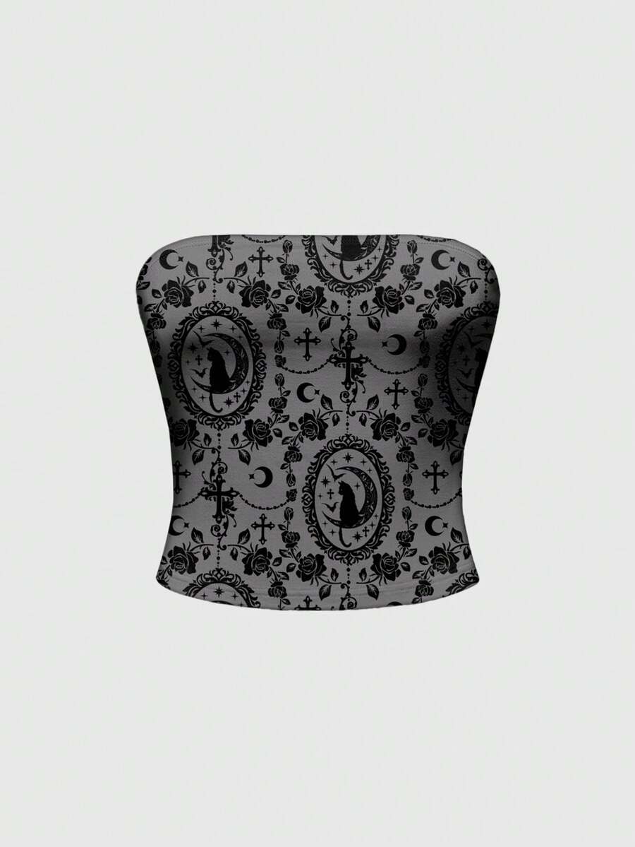 Goth Top de camisola sexy con diseño de cruz gótica, rosa, sol, luna, estrella y gato de bosque, en negro y gris para mujeres
