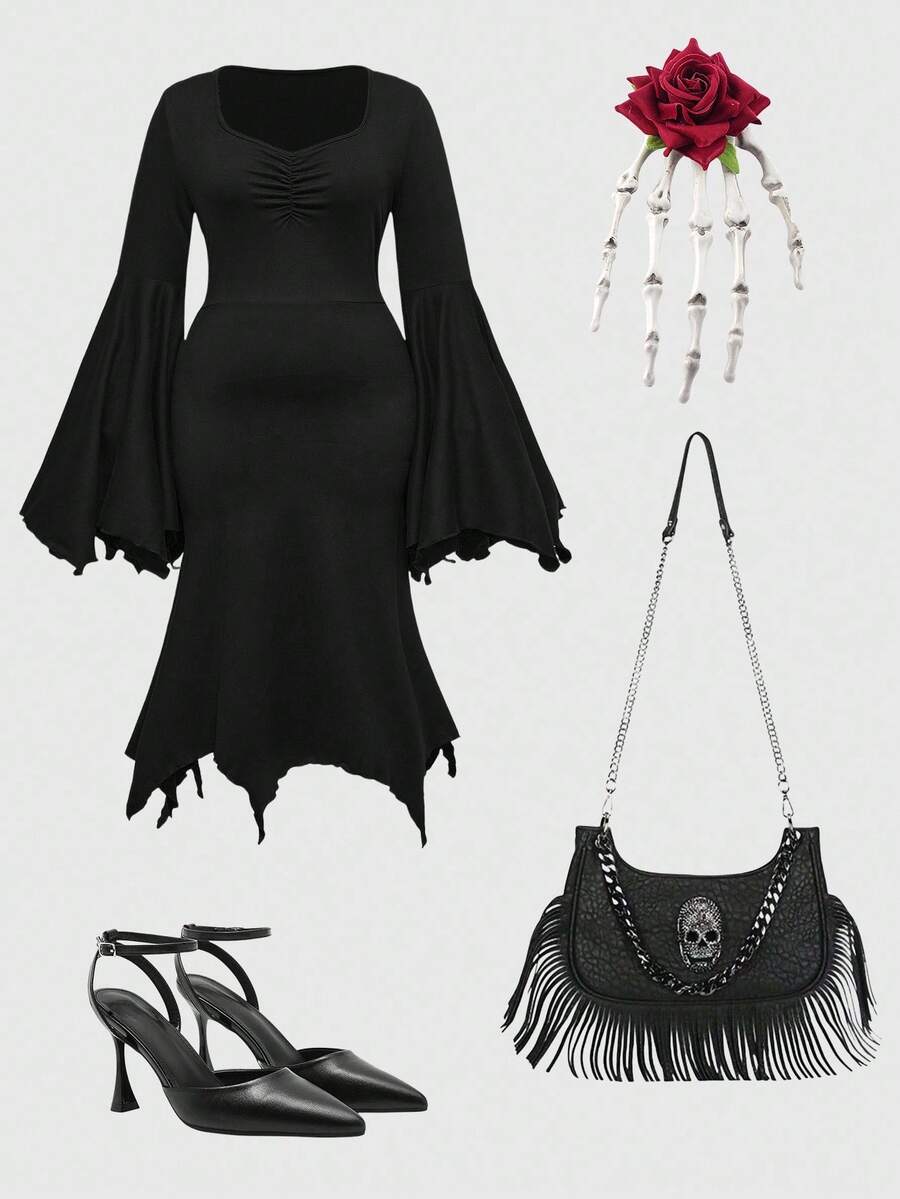Goth Vestido negro de talla grande con cuello de murciélago alienígena, de estilo gótico y misterioso para fiestas de terror