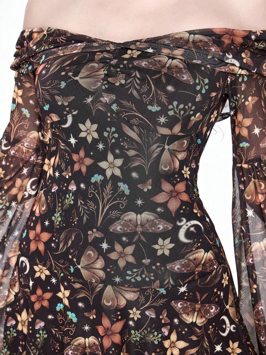 Goth Vestido con estampado todo sobre de hoja marchita, polilla, floral, estrella y seta con mangas acampanadas y hombros descubiertos en estilo gótico vintage