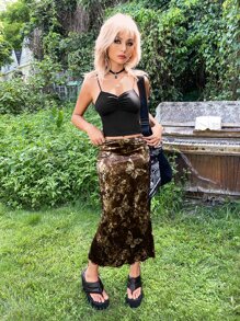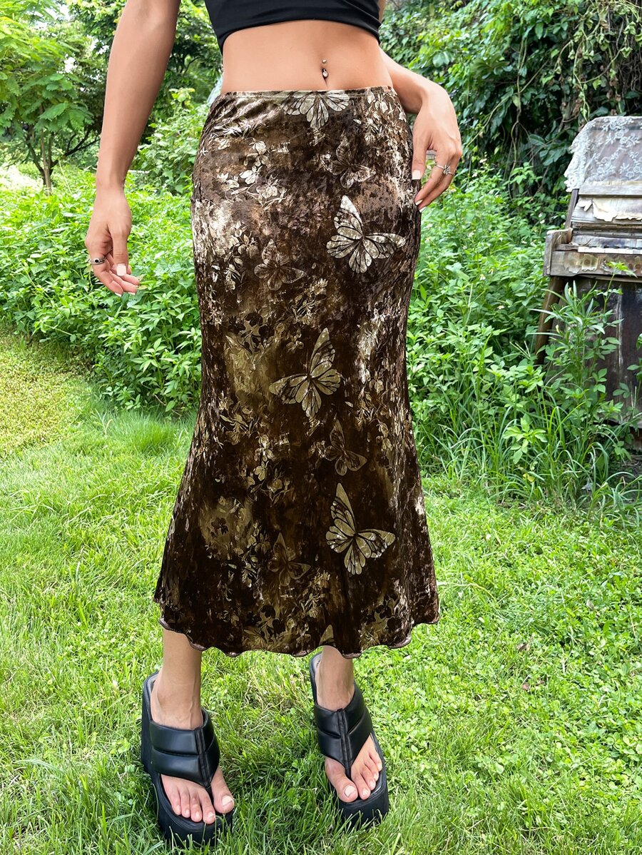 Falda de talle alto con estampado de mariposa ribete en forma de lechuga de terciopelo