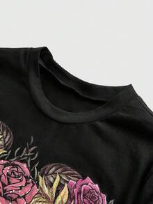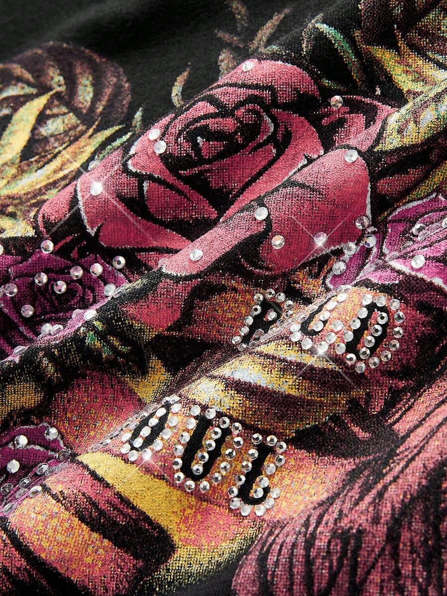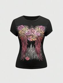 Grunge Punk Camiseta ajustada de mujer con estampado de alas multicolor con efecto desgastado y adornos de rhinestones