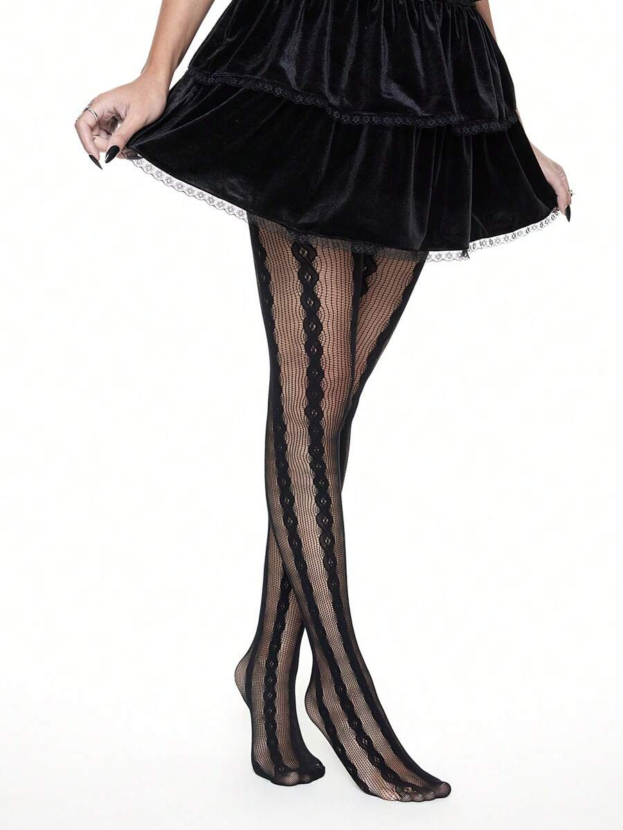 Grunge Punk 1 par de calcetines de mujer con rayas verticales, ribete de encaje estilo rejilla, versátiles y elegantes, para todo el año