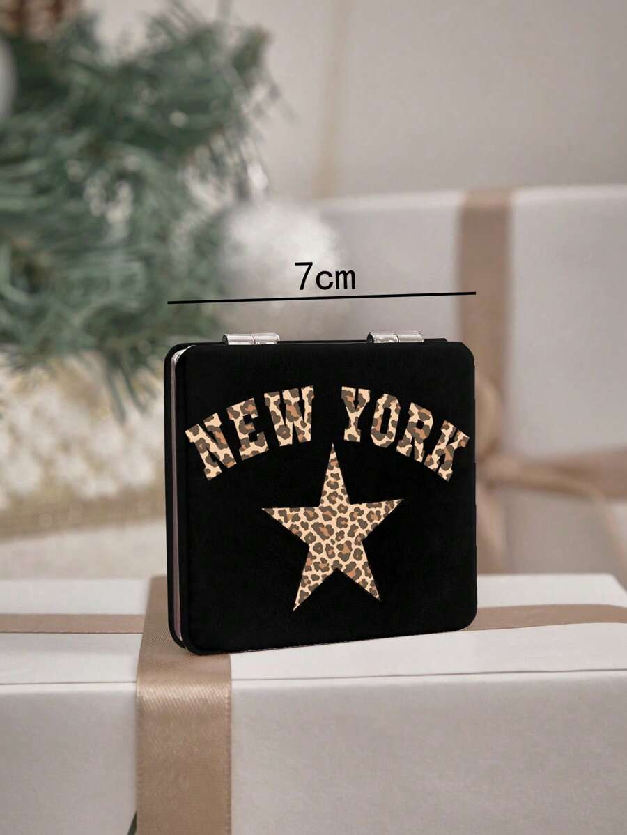 Grunge Punk 1 pieza Espejo cuadrado negro con estampado de leopardo y estrella, espejo de mano portátil para maquillaje para niñas, adecuado para uso en el hogar, viajes y al aire libre (los patrones pueden variar)