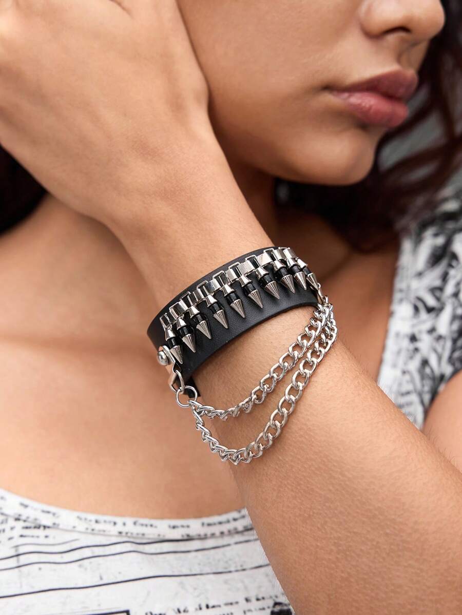 Grunge Punk 1 pieza Brazalete grande con remaches de bala en estilo punk, brazalete de cordón unisex, brazalete para pareja