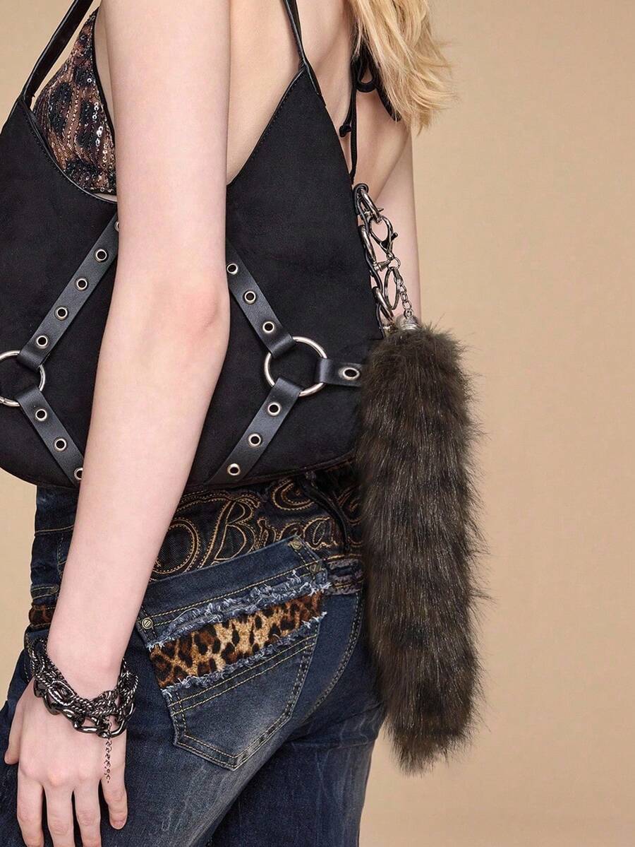 Grunge Punk 1 pieza Accesorio de cola de animal de peluche con estampado de lunares de leopardo de imitación de piel de zorro ondulada de alta calidad en estilo retro Y2K, adecuado para mujeres, uso diario, regalo de vacaciones