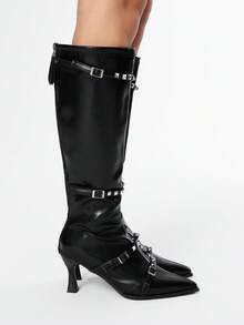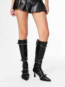Grunge Punk Botas de montar de tacón de aguja con puntera puntiaguda y remaches de PU negro, nuevas llegadas de primavera/otoño 2025 para mujer. Botas altas elegantes y sexys de tacón alto