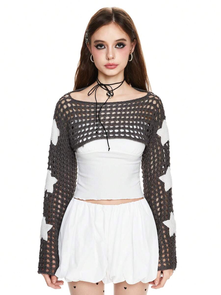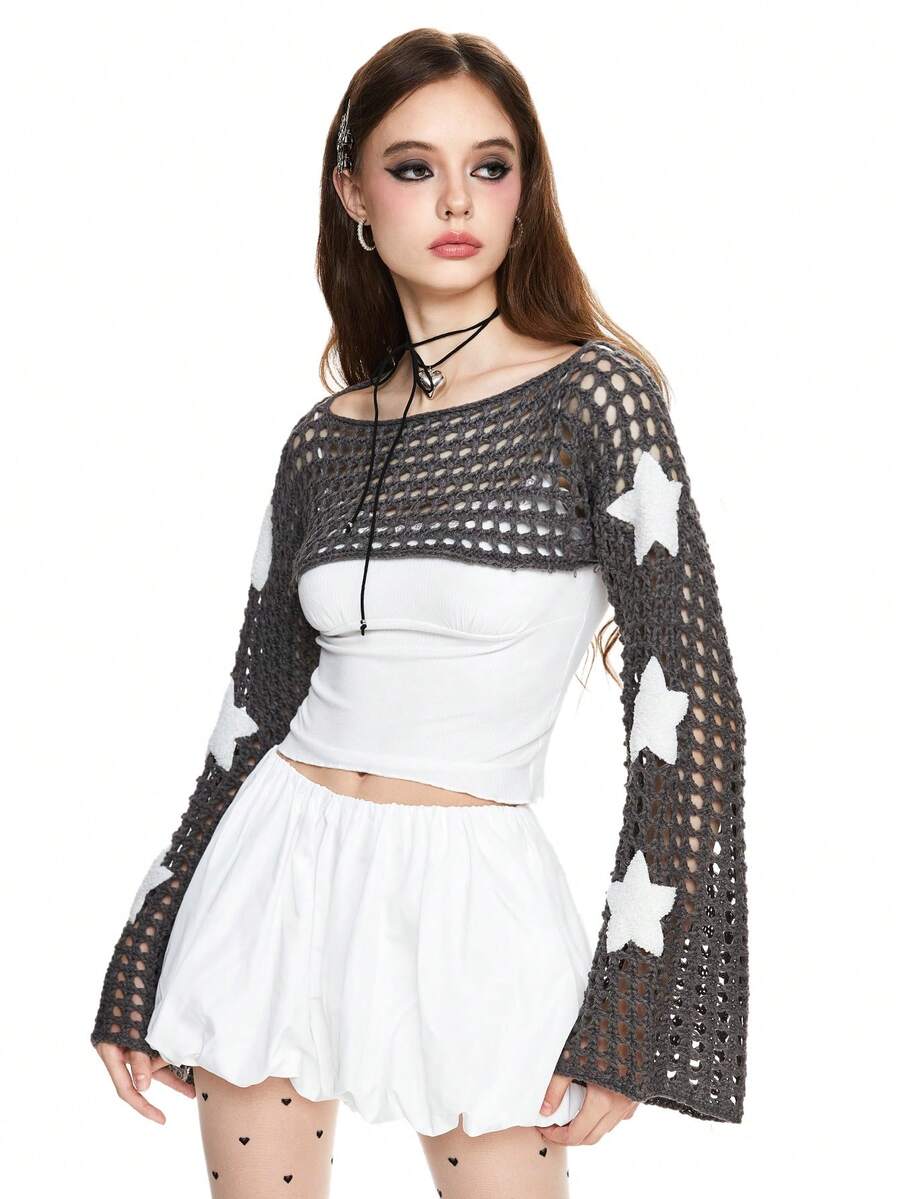 Grunge Punk Top con tirantes acampanados, adecuada para colocar sobre camisetas o tirantes finos, con bordado de estrellas Hollow Out