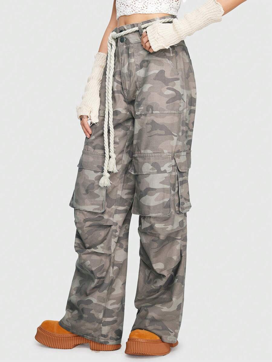 Grunge Punk Jeans con estampado de camuflaje con bolsillo con solapa con cinturón