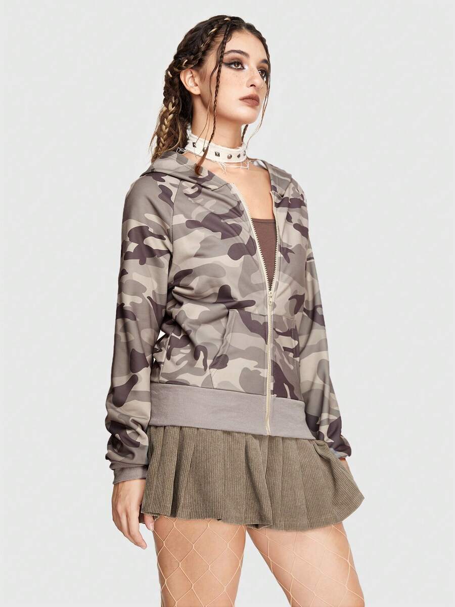 Grunge Punk Capucha con estampado de camuflaje con cremallera de manga raglán