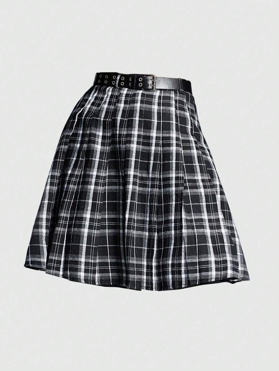 Grunge Punk Falda plisada A-line a cuadros y cinturón versátil de estilo casual chic para mujeres como estudiante