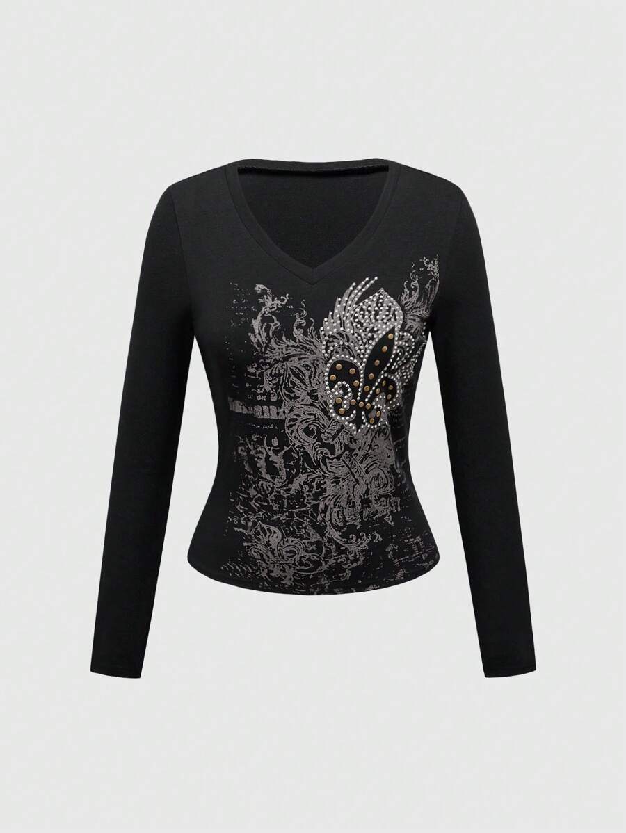 Grunge Punk Camiseta de manga larga informal con escote en V, patrón de alas y rhinestones para mujer