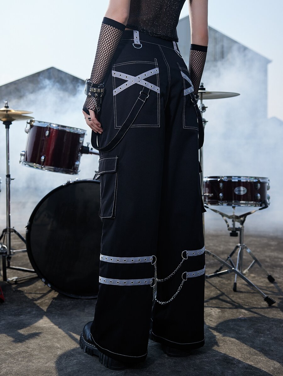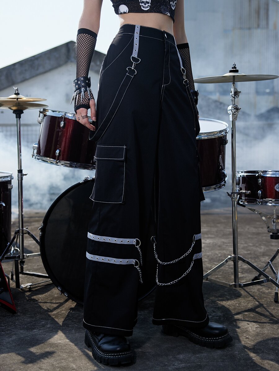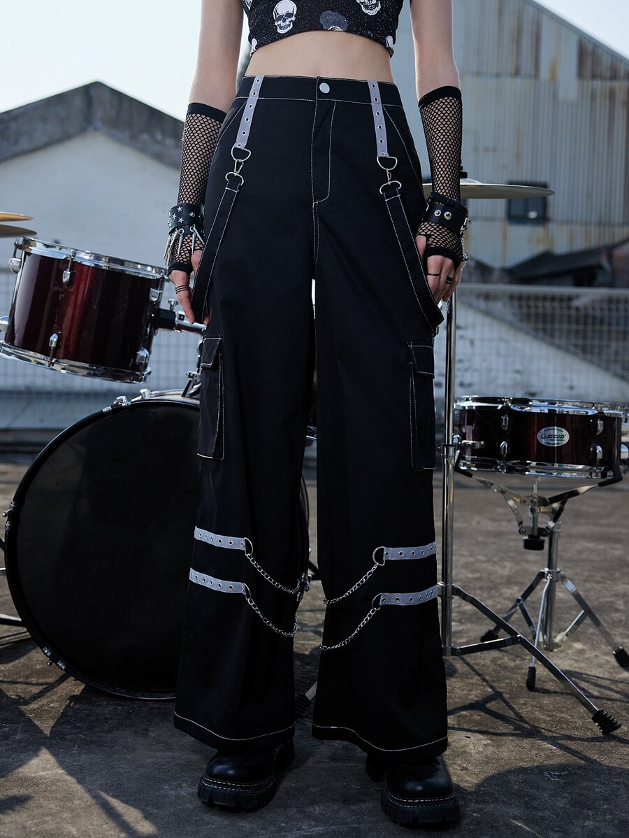Grunge Punk Pantalones cargo con cinta en contraste con bolsillo con solapa con diseño de cadena