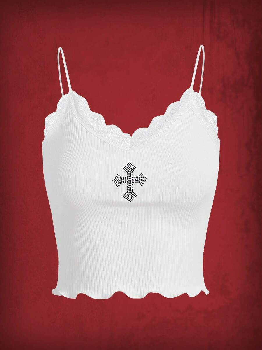 Grunge Punk Top de tirantes cruzado con diamante de imitación ribete en forma de lechuga