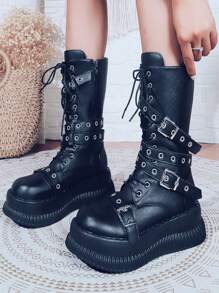 Grunge Punk Botas De Mujer De Tacón Alto Estilo Europeo Y Americano Con Hebilla De Metal, Puntera Redonda Y Estilo Punk Para Otoño E Invierno Con Suela Gruesa